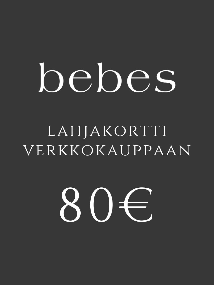Huom. Tämä lahjakortti käy maksuvälineenä ainoastaan Bebes-verkkokaupassa www.bebes.fi. Lahjakortin saldo tulee verkkokaupassa käyttää kerralla. Saldoa ei voi käyttää toimituskulujen maksamiseen.