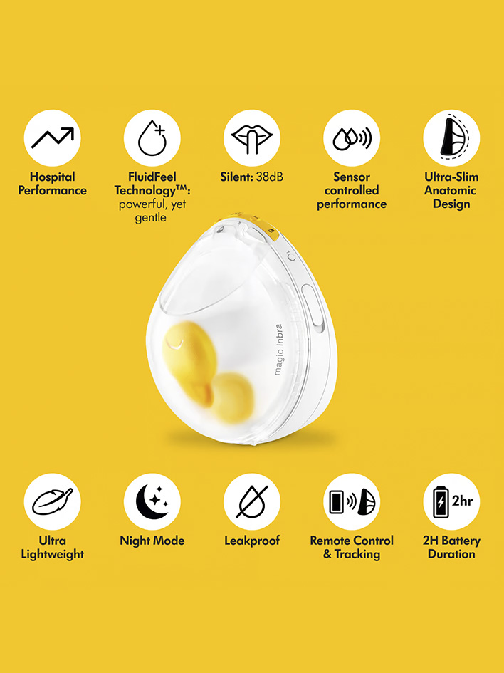 Elektroninen Hands-free rintapumppu Medela Magic In Bra™ Single on hellävarainen, puettava rintapumppu ilman kompromissejä. Magic InBra™ on kevyt (200g), hiljainen (38dB) ja se kulkee mukanasi askareissa rintaliiveihin sijoitettuna. Rintapumpussa yhdistyvät mukavuus ja vapaus sekä perinteisen rintapumpun teho ja tuottavuus.