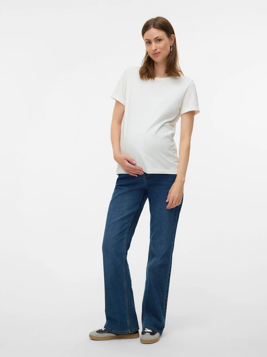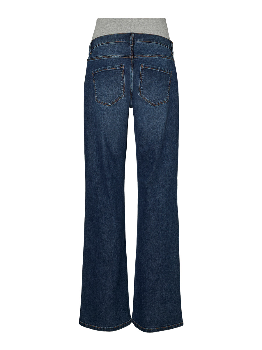 Äitiysfarkut Edina Flared Dark Medium Blue ovat rennot äitiysfarkut bootcut levenevillä lahkeilla. Trikoinen vyötäisosa nousee vatsan päälle ja tukee vatsaa kevyesti. Farkuissa on taskut sekä edessä että takana sekä vetoketju ja nappi edessä.