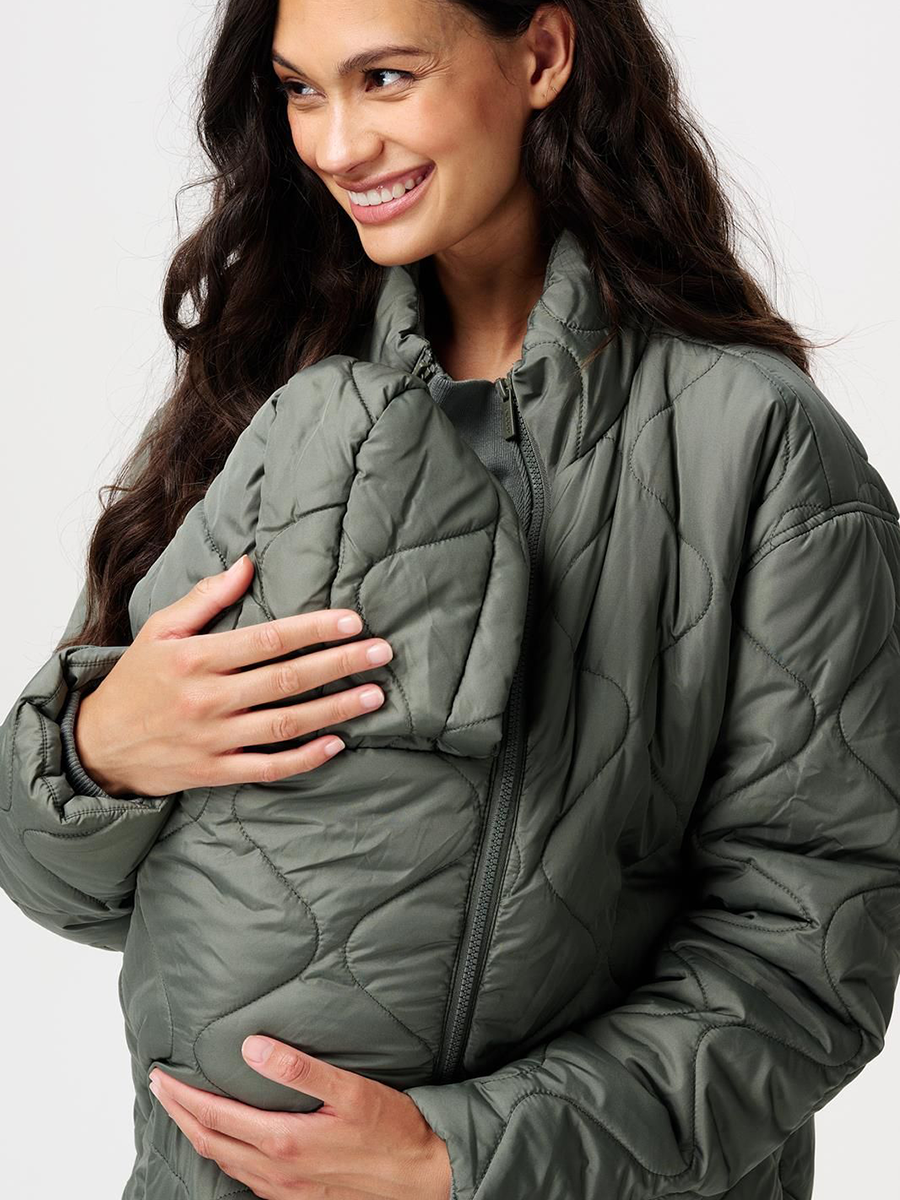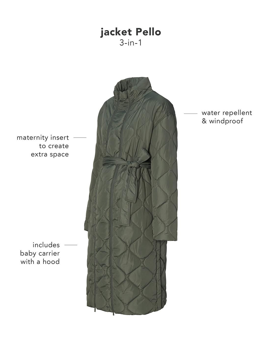 Äitiys- ja kantotakki Pello 3-way Olive on mukava, kaunis ja lämpimästi topattu tikkitakki kangasvyöllä. Voit käyttää takkia kolmella eri tavalla: tavallisena takkina, raskaustakkina sekä vauvan kantotakkina. Kahdella erillisellä, vetoketjulla kiinnitettävällä paneelilla voit muokata takin aina tilanteen mukaan, joten se palvelee sinua vuosia!