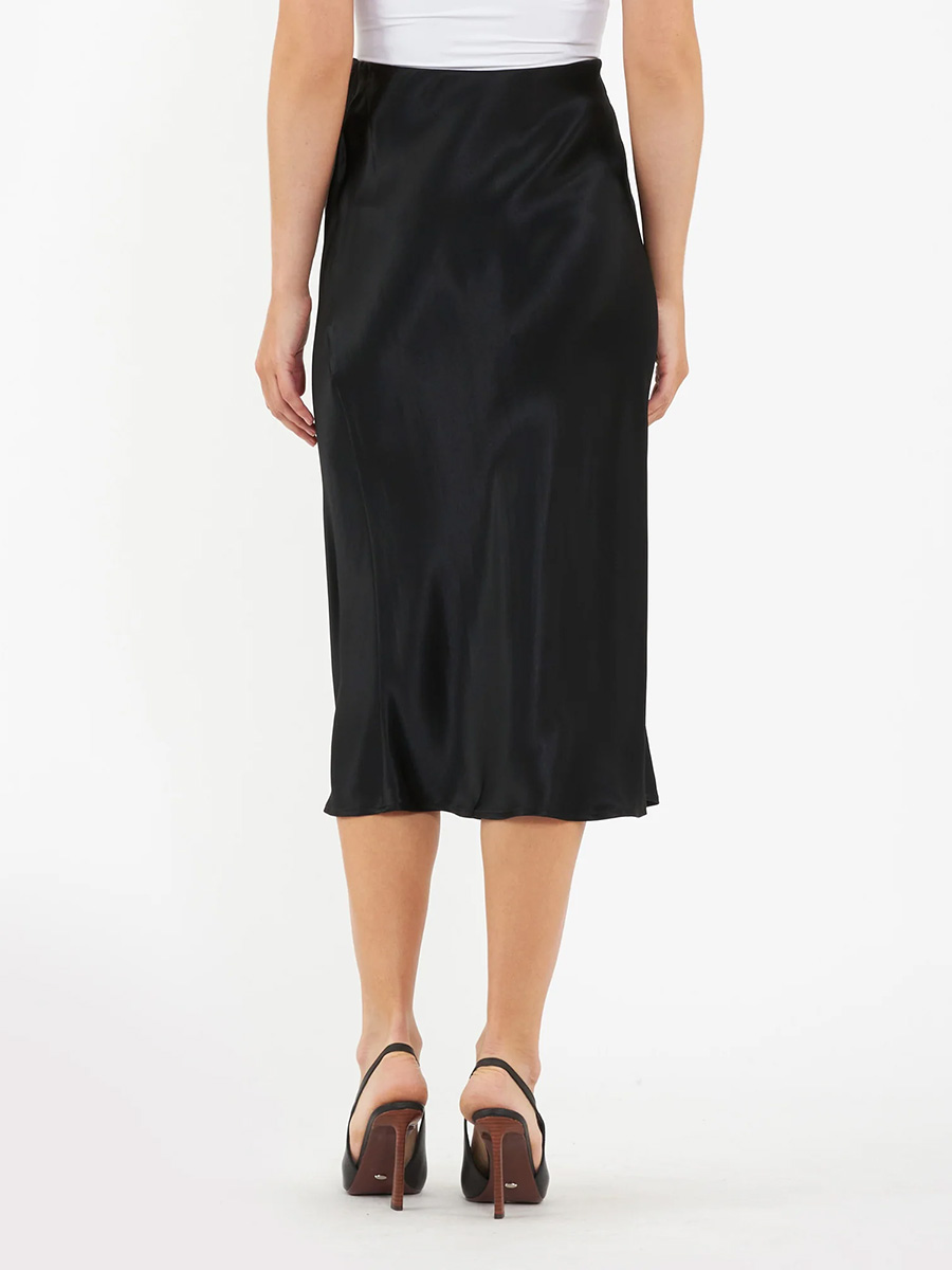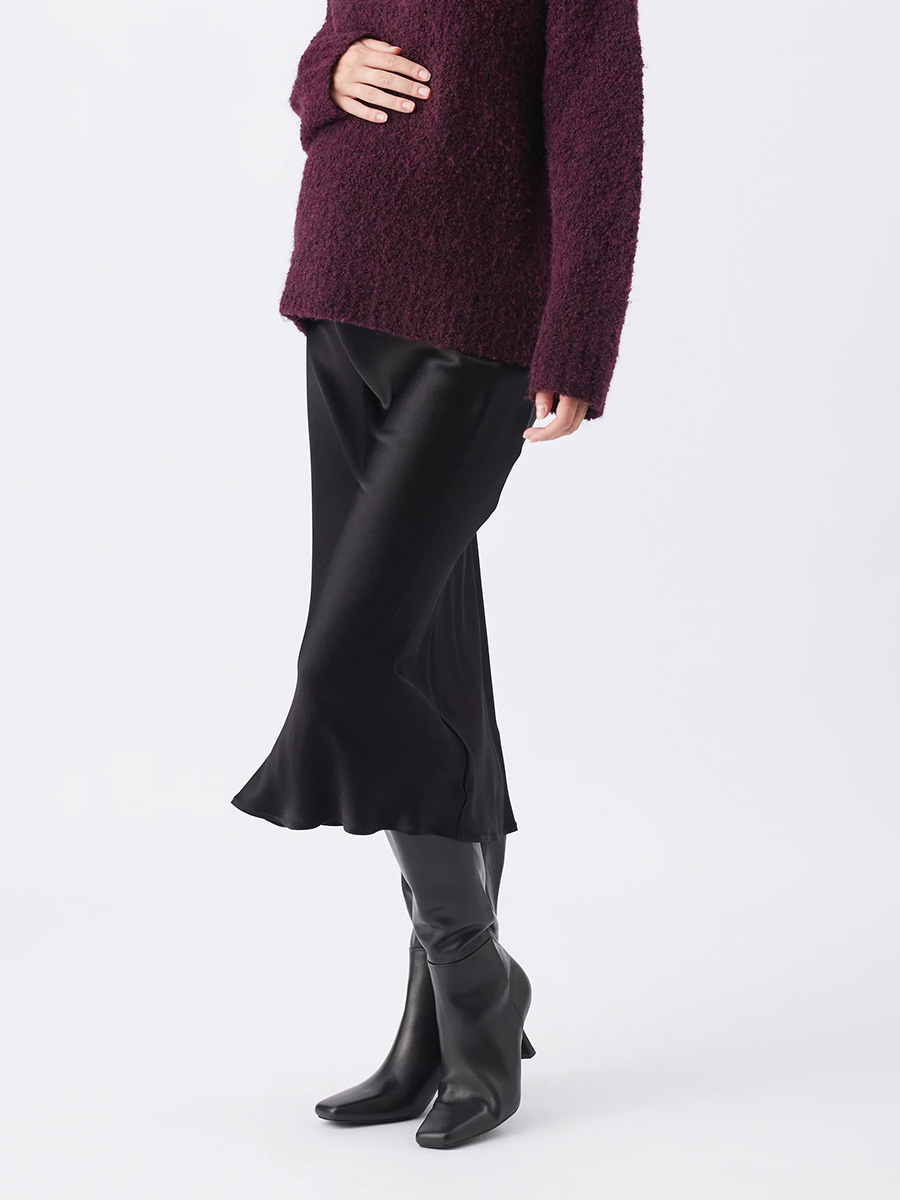 Äitiyshame Crystal Satin Skirt Black on kudottu ylellisestä satiinista. Bias-leikattu kangas ja kevyesti vartalon myötäinen malli saa sen laskeutumaan upeasti ja luo elegantin siluetin.
