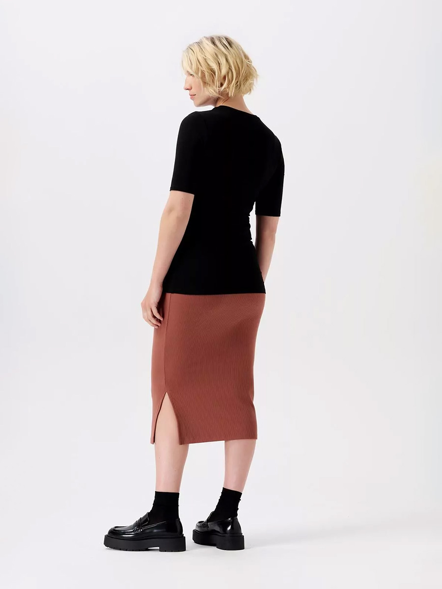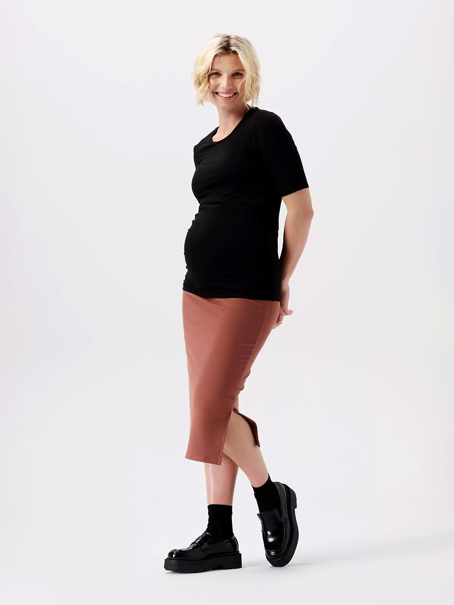 Äitiyshame Vija Rib Skirt Sienna on fantastinen perusta upean odottajan vaatekaappiin! Tyköistuva kynähame joustaa miellyttävästi kasvavan vatsan päällä ja on helppo yhdistellä tyylikkäästi tilaisuuksiin tai rennosti neuleen kanssa. Ei kiristäviä tai puristavia vyötäissaumoja!