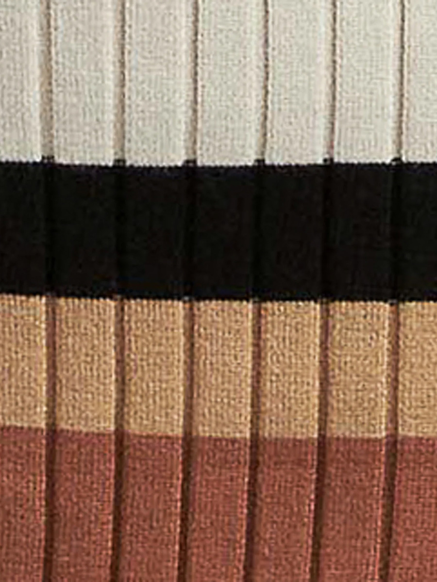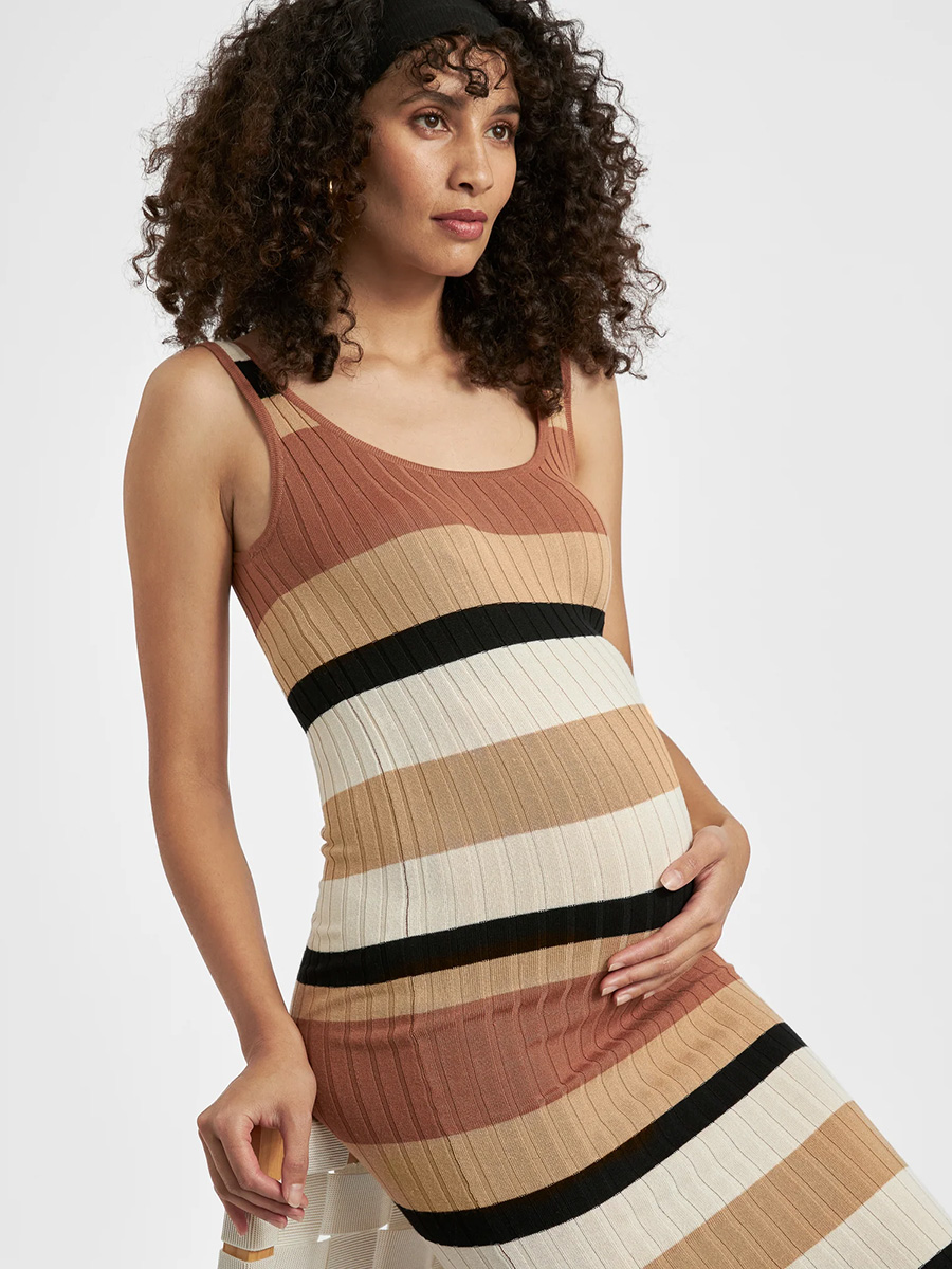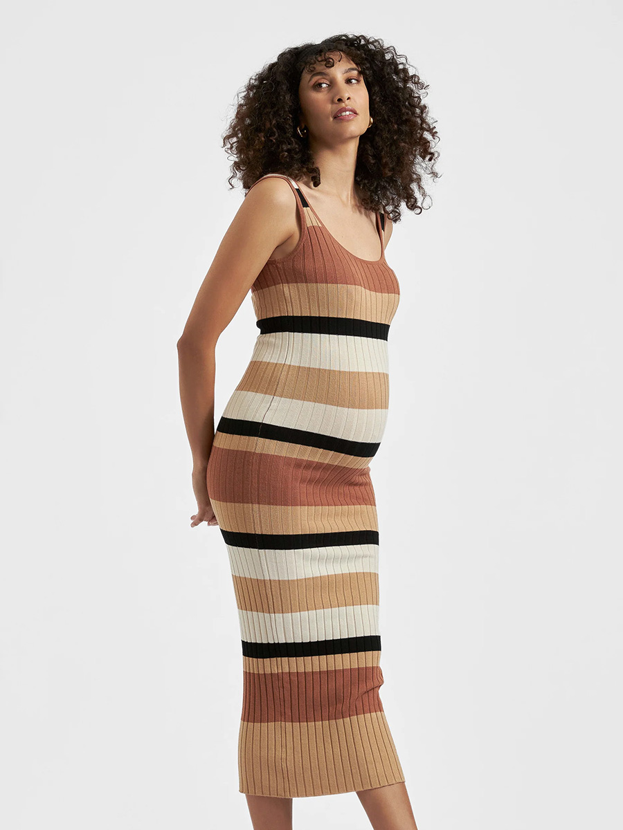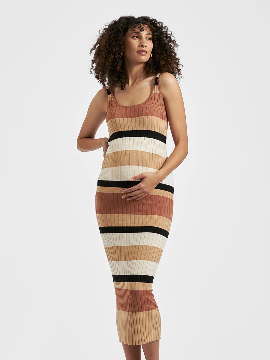 Äitiysneulemekko Sarah Stripe Knit Dress on vartaloa myötäilevä mekko ribbineuloksesta. Mekossa on syväänuurrettu pyöreä pääntie sekä edessä että takana sekä pitkä, alle polvien yltävä helma.