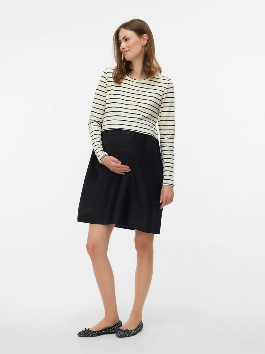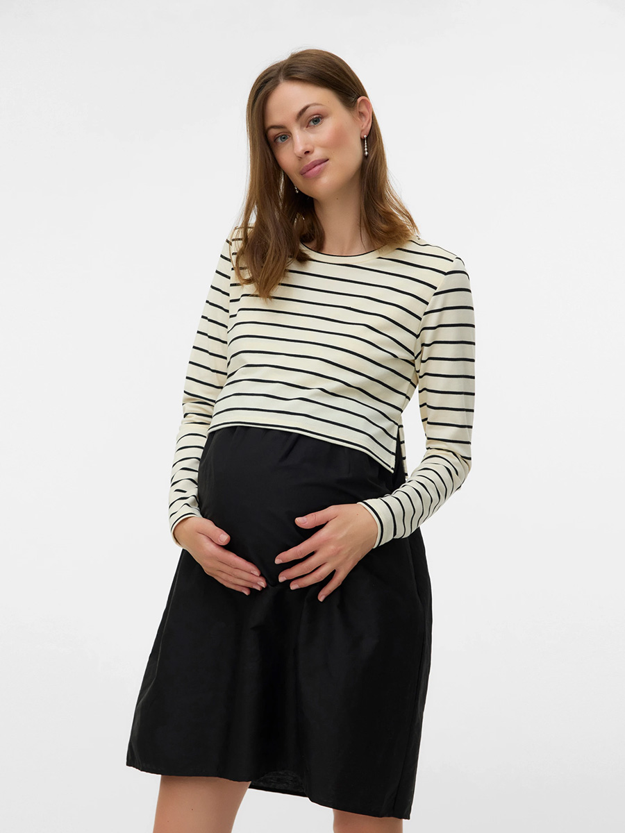Imetysmekko Amilo June on mukava ja pehmeä arkimekko pitkähihaisella raidallisella yläosalla sekä mustalla helmalla. Joustava mekko on helppo pukea ja sopii jokaiseen päivään! Kangas joustaa raskausvatsan kasvaessa ja vauvan synnyttyä imetys onnistuu vaivatta huomaamattomien laskosten kautta.