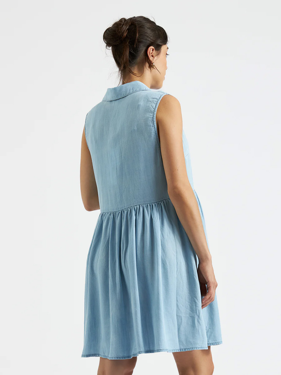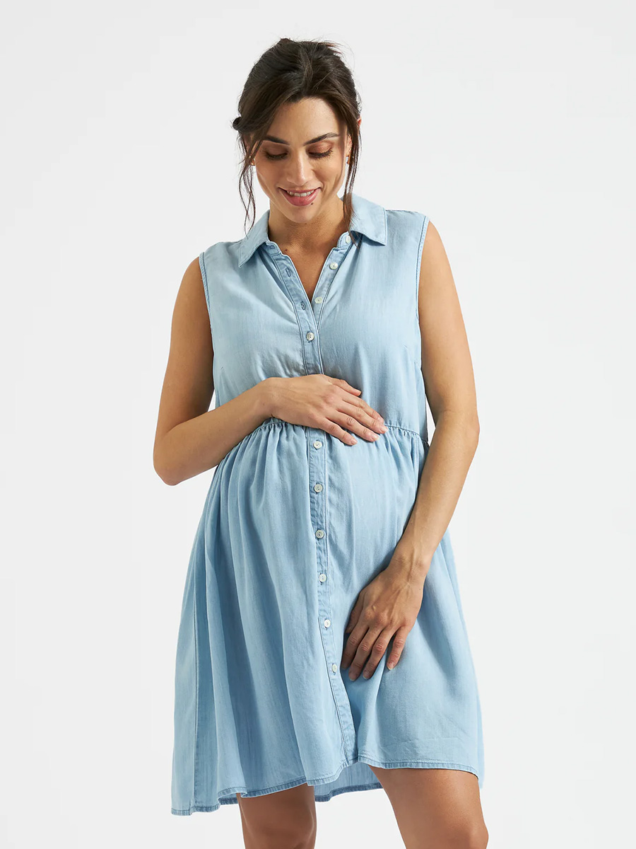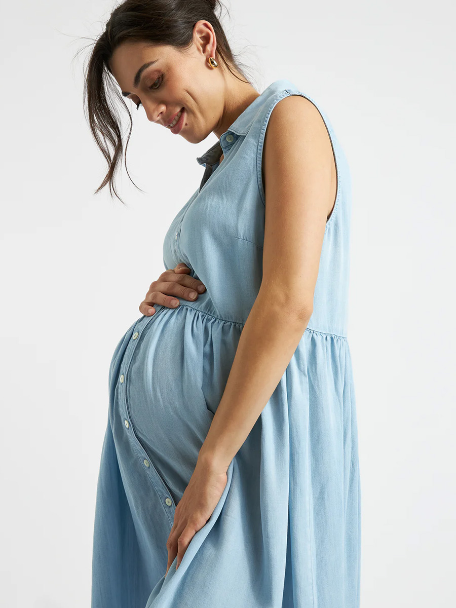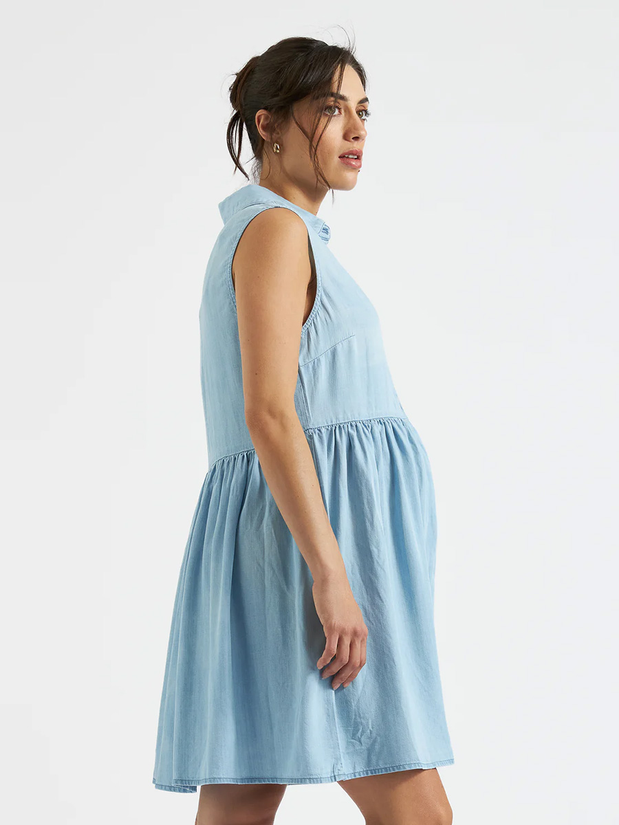 Imetysmekko Bec Chambray Dress on rakastettu denim-mekko kokopitkällä nappirivillä ja kauluksilla. Hihattomassa mekossa on rento leikkaus: helman rypytys antaa tilaa kasvavalle vatsalle ja napit avaamalla imetys onnistuu vaivatta.