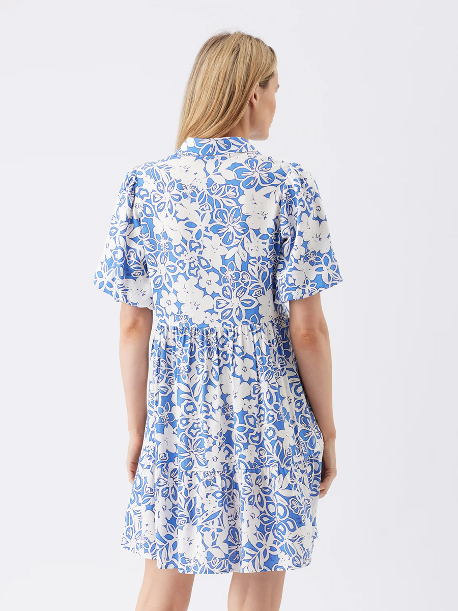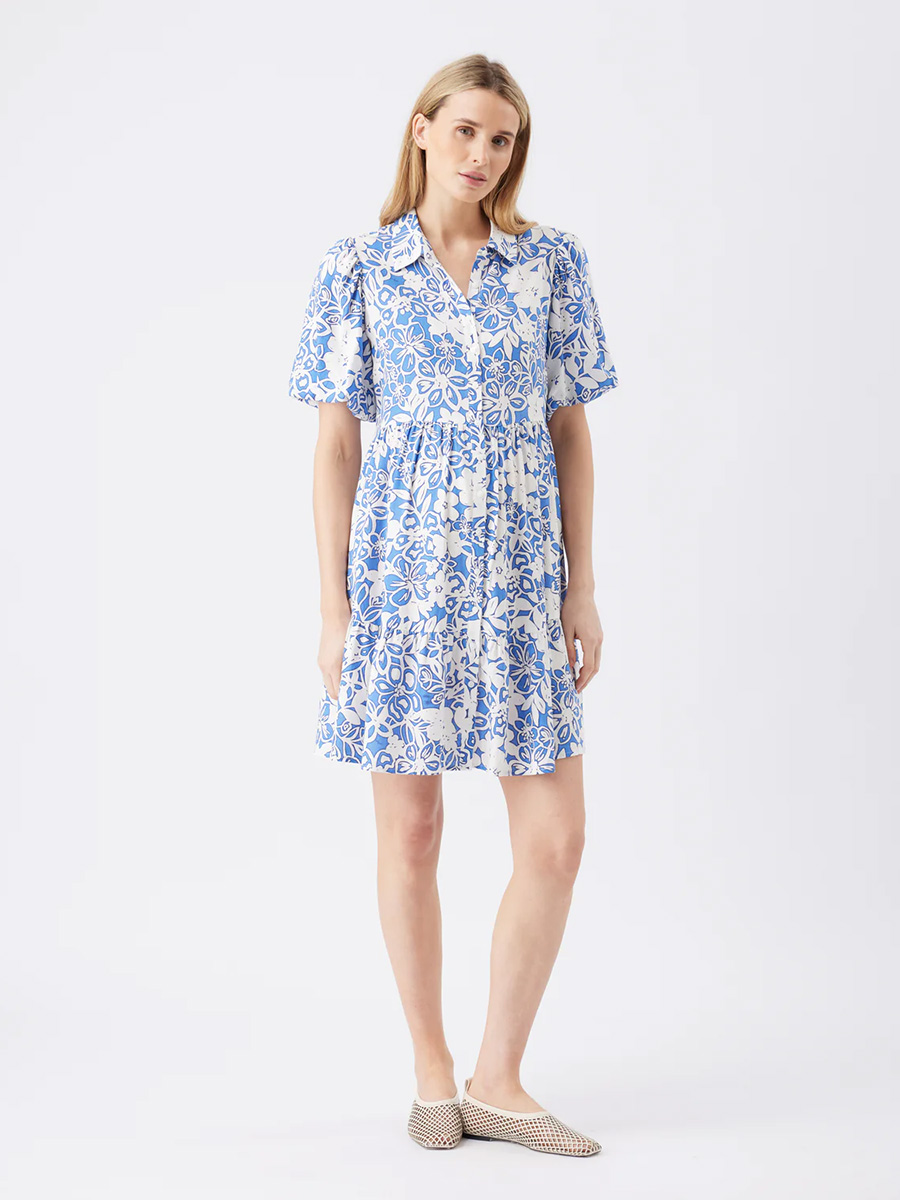 Lyhyissä hihoissa on näyttävä pussitus ja pyöreää pääntietä koristavat klassiset kaulukset. Helman pituus on polvien yläpuolelle.
