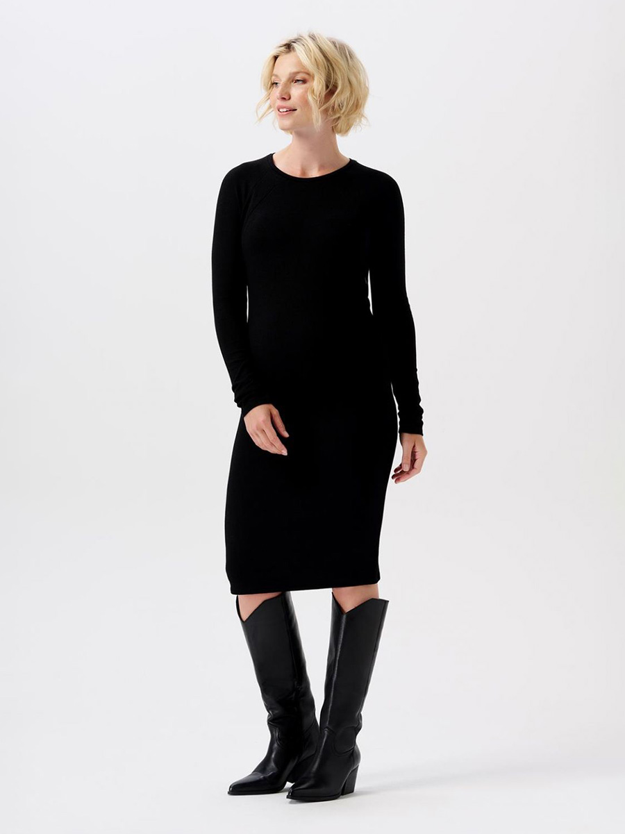 Mekossa on pitkät hihat, polvien alapuolelle ulottuva helma sekä pyöreä pääntie. Tyköistuva mekko imartelee vartalon muotoja, joustaa ja on ihanan mukava myös raskaudesta palautumisen aikana.