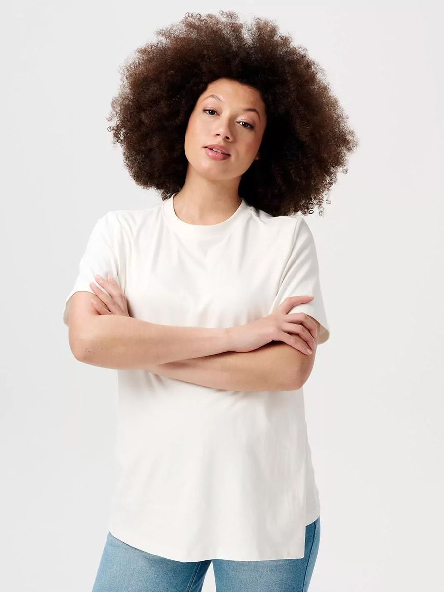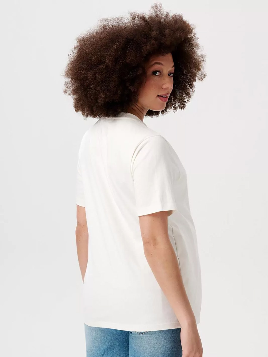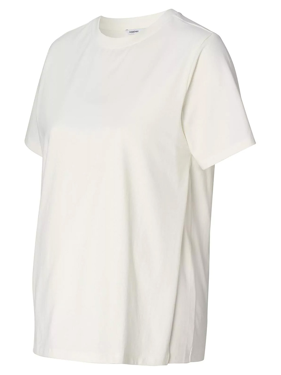 T-paita on malliltaan väljä ja klassisen suoraan leikattu. Se sopii niin äitiysaikaan, imetykseen kuin niiden jälkeen. Etuosan kankaassa on huomioitu kasvava vatsa, joten se on aavistuksen takaosaa pidempi.