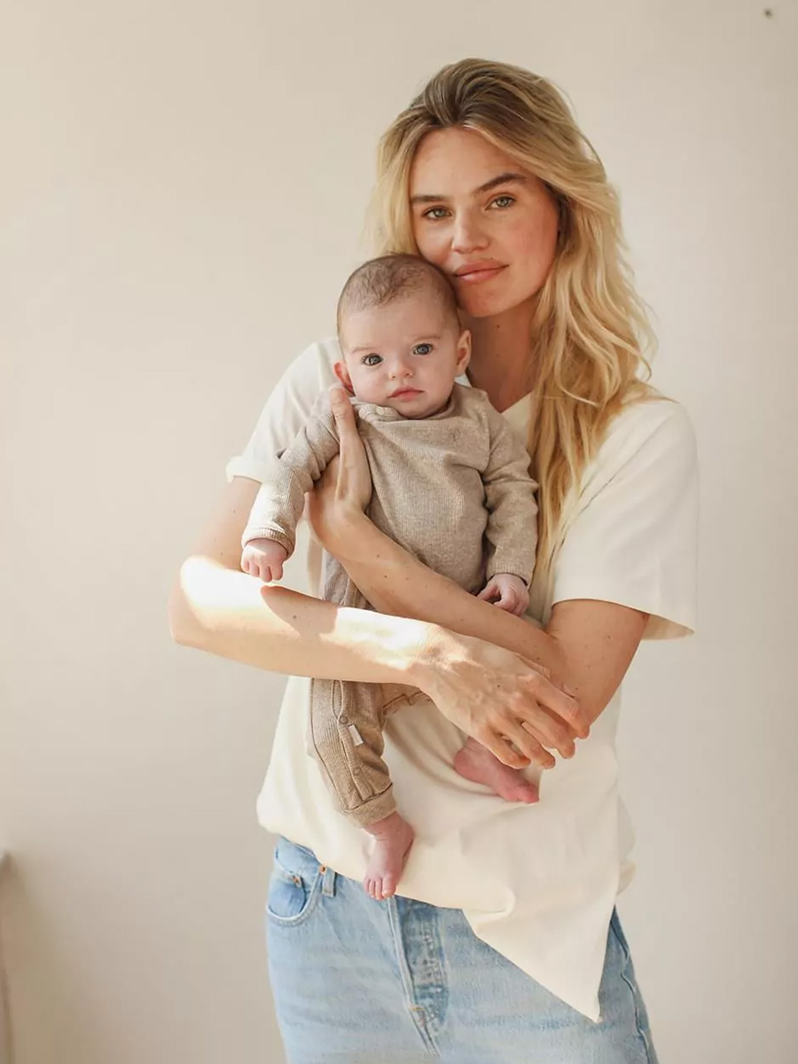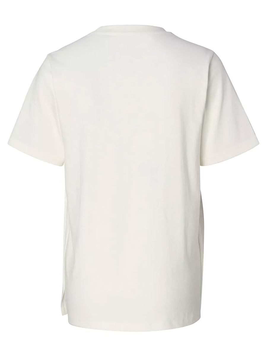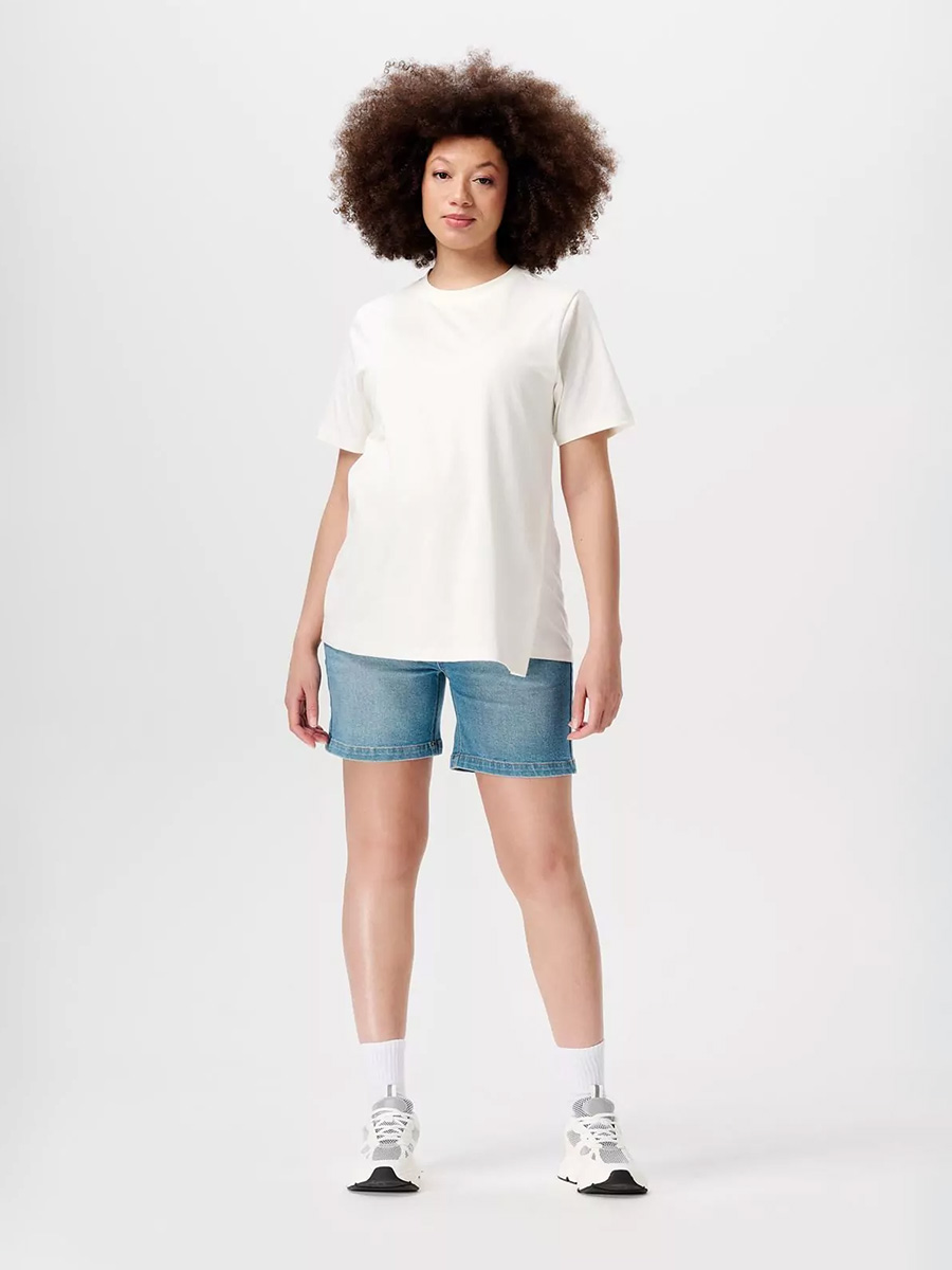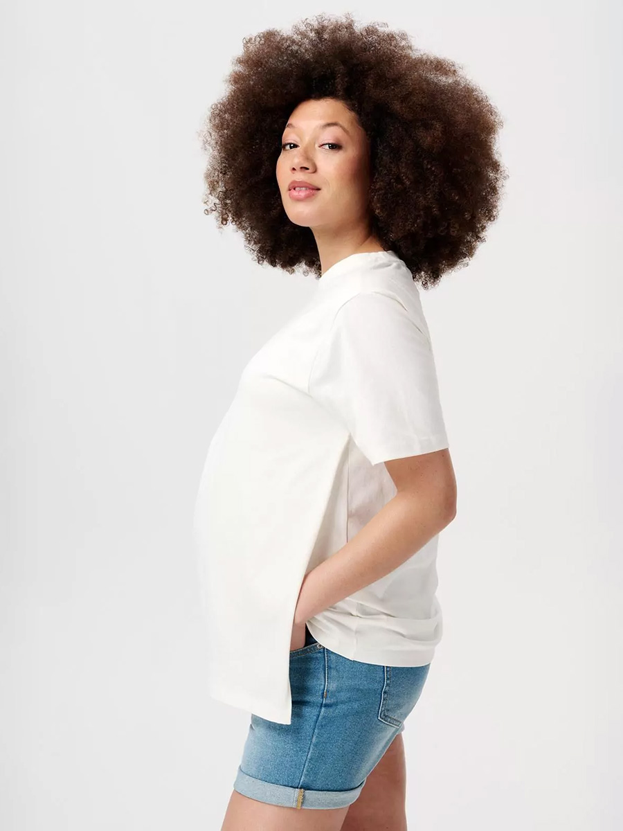 T-paita on malliltaan väljä ja klassisen suoraan leikattu. Se sopii niin äitiysaikaan, imetykseen kuin niiden jälkeen. Etuosan kankaassa on huomioitu kasvava vatsa, joten se on aavistuksen takaosaa pidempi.