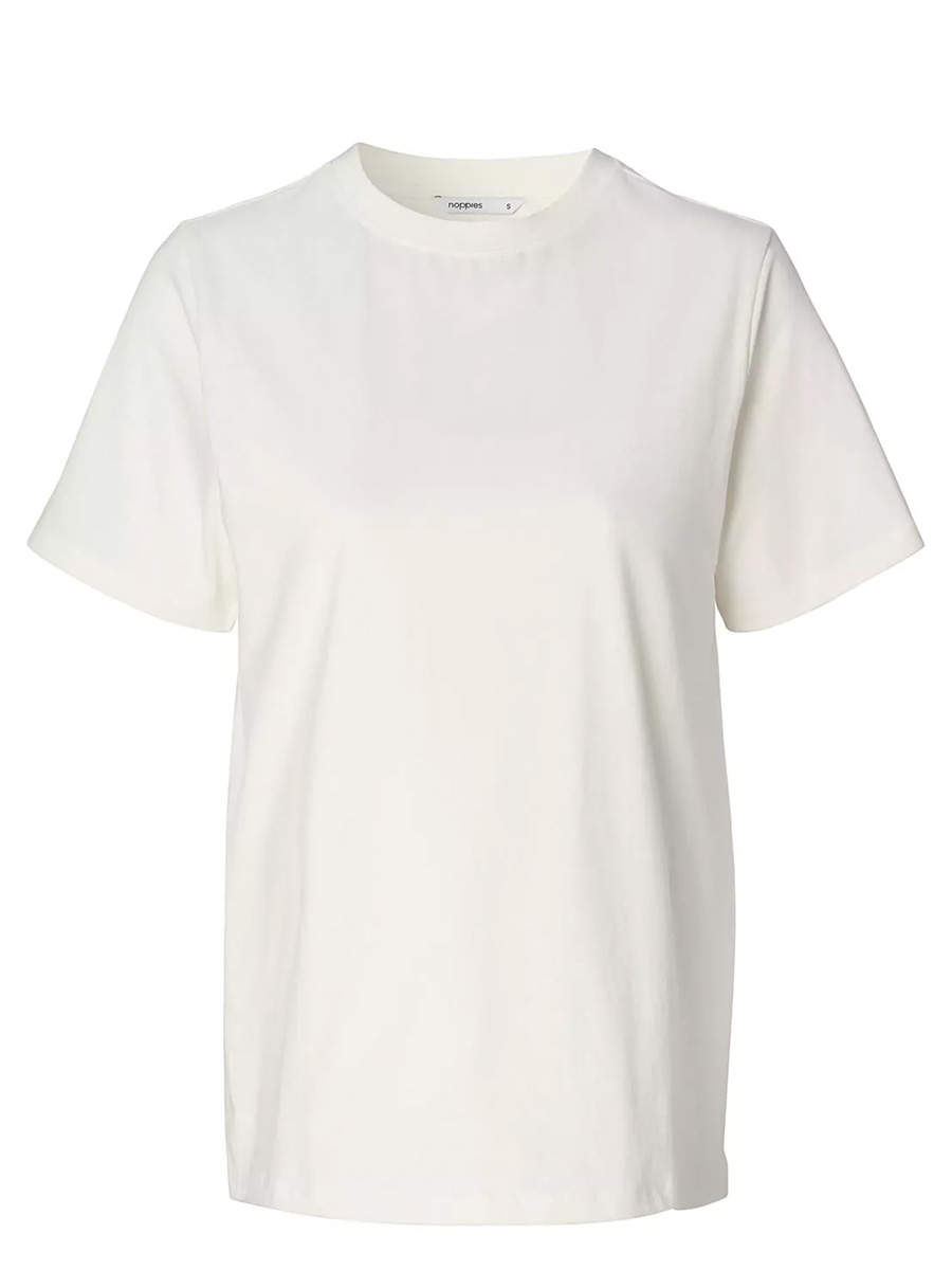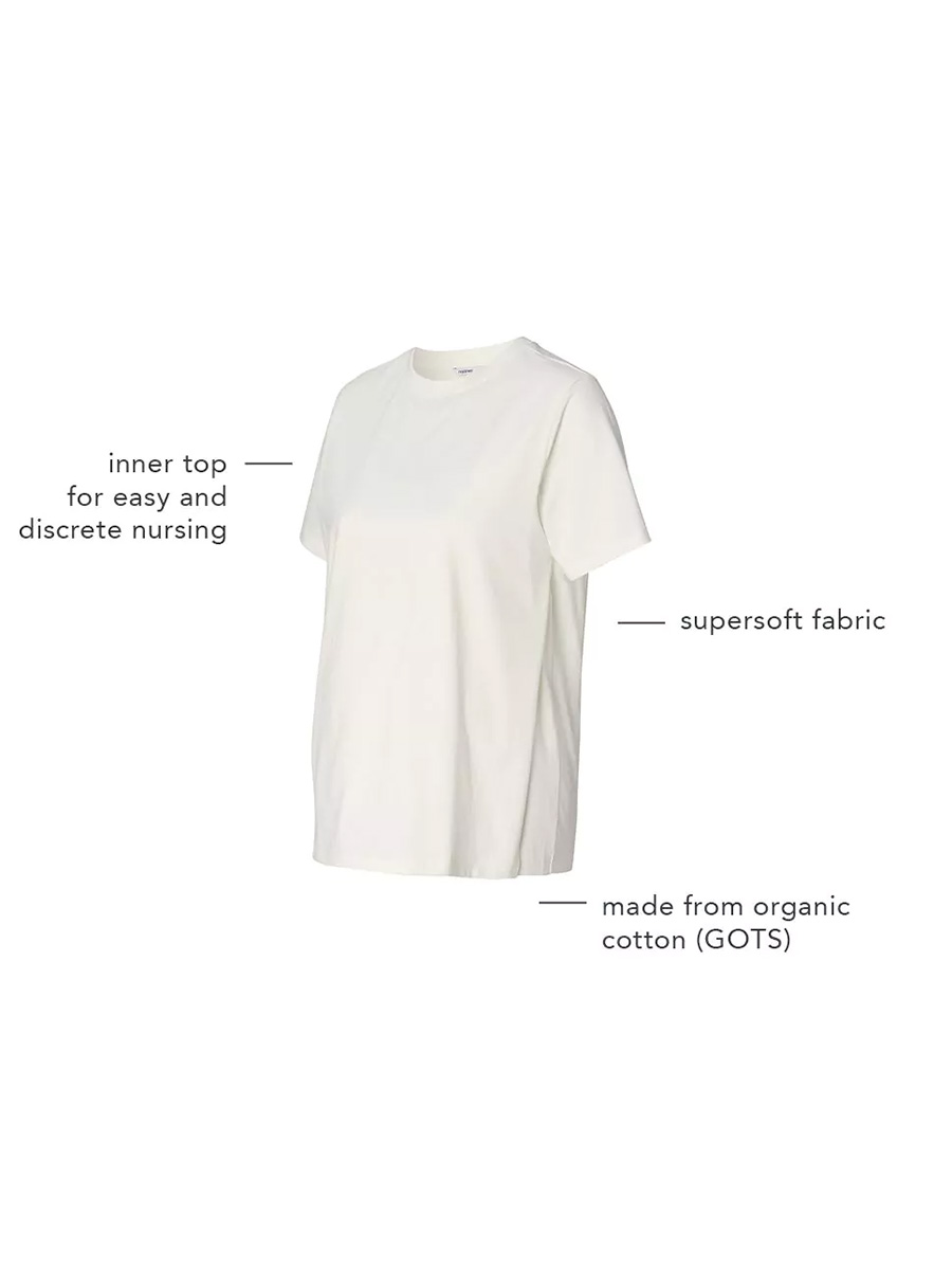 Imetys T-paita Ifke Cream, minimalistisen linjakas ja rento t-paita, josta ei päällepäin huomaa sen olevan imetyspaita. Etuosassa on kaksi kangasta päällekkäin ja imetysaukko löytyy alemmasta kankaasta.
