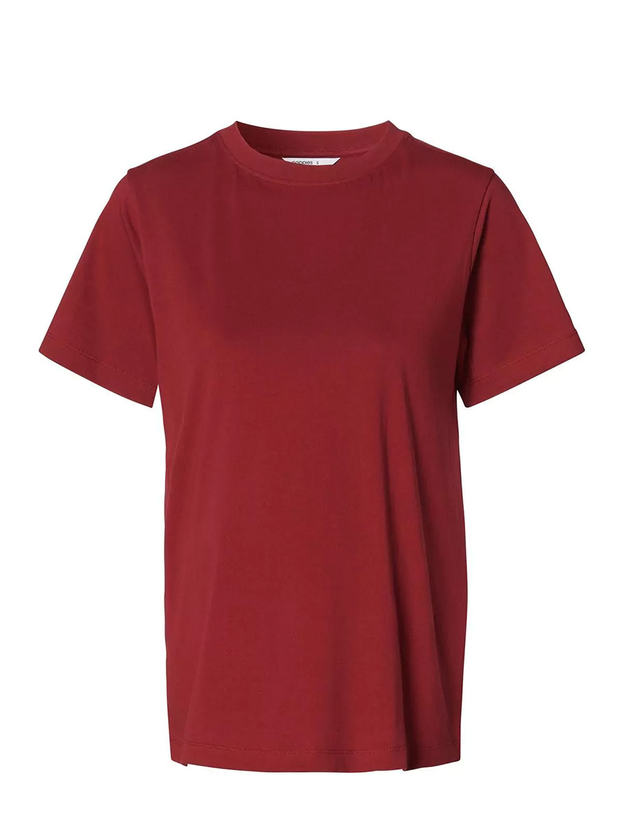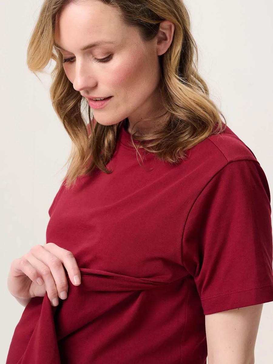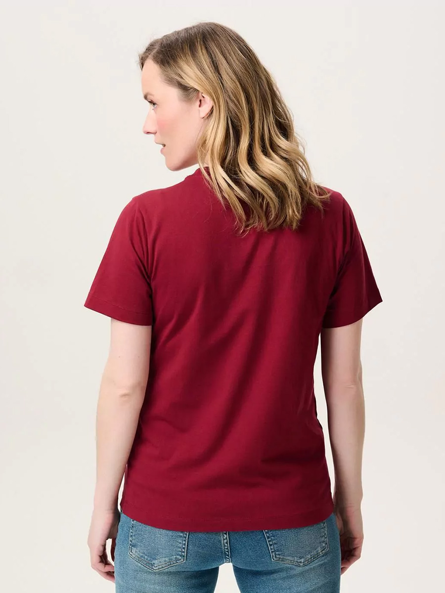 Imetys T-paita Ifke Tibetan red, minimalistisen linjakas ja rento t-paita, josta ei päällepäin huomaa sen olevan imetyspaita. Etuosassa on kaksi kangasta päällekkäin ja imetysaukko löytyy alemmasta kankaasta.