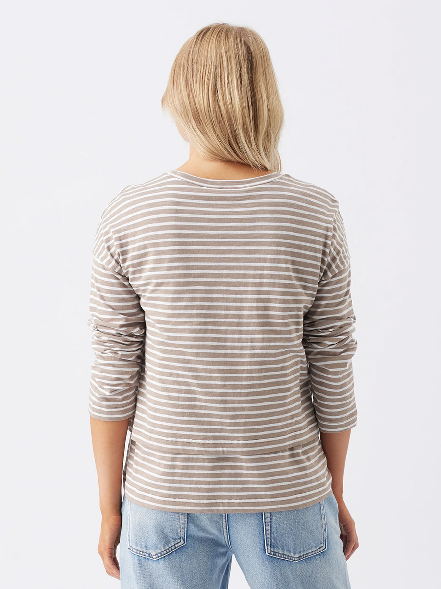 Imetyspaita pitkähihainen Claudette Taupe / White on rento oversized paita laatikkomaisella leikkauksella. Värityksenä rauhallinen taupen ja raikkaan valkoisen raidoitus.