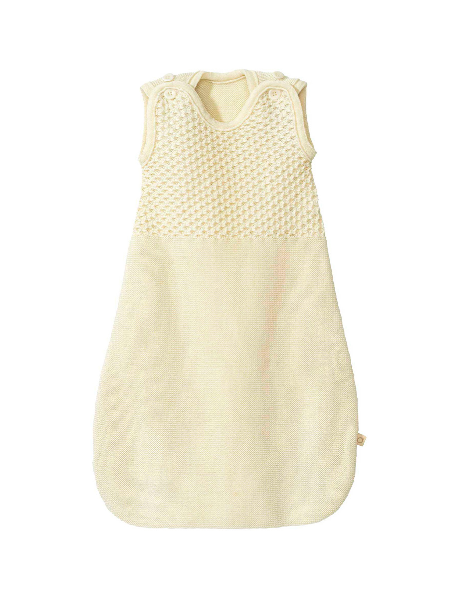 Vauvan unipussi Sleeveless Sleeping bag on pehmeä ja lämmin, merinovillainen unipussi joustavan pehmeästä neuloksesta. Hihaton unipussi on kuin turvallinen peitto, joka pitää vauvan tasaisen lämpimänä koko yön, mutta vauva ei saa sitä potkittua pois. Unipussin pukeminen voi parhaillaan luoda vauvalle tutun rituaalin nukkumiseen menoon.