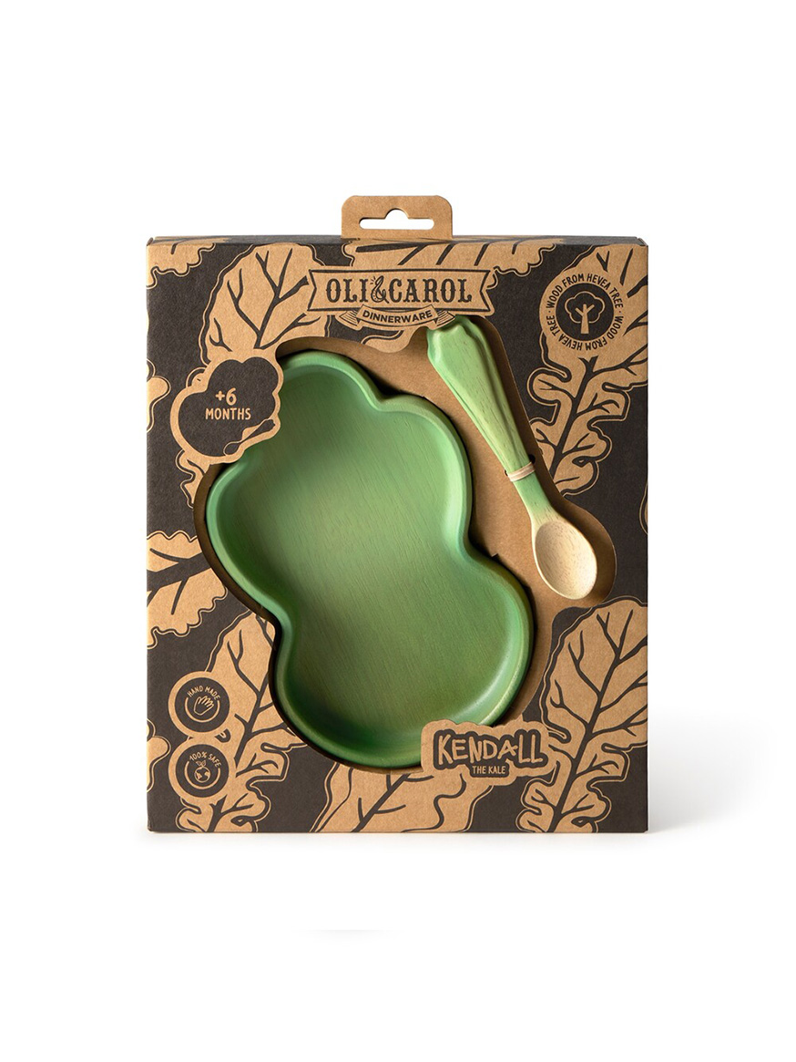 Oli&Carol lautanen ja -lusikka setti sisältää ihanan lautasen ja lusikan, jotka on käsintehty Hevea-puusta. Hauska ja värikäs muotoilu on saanut inspiraationsa kasvisten maalimasta. Puiset astiat ovat turvallinen, muoviton ja kestävä valinta lapsille ja antavat toisen elämän puille, jotka aikoinaan tarjosivat kumia Oli&Carol-leluille.