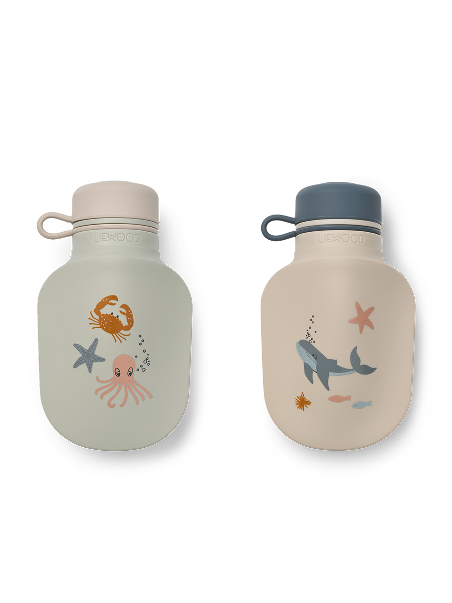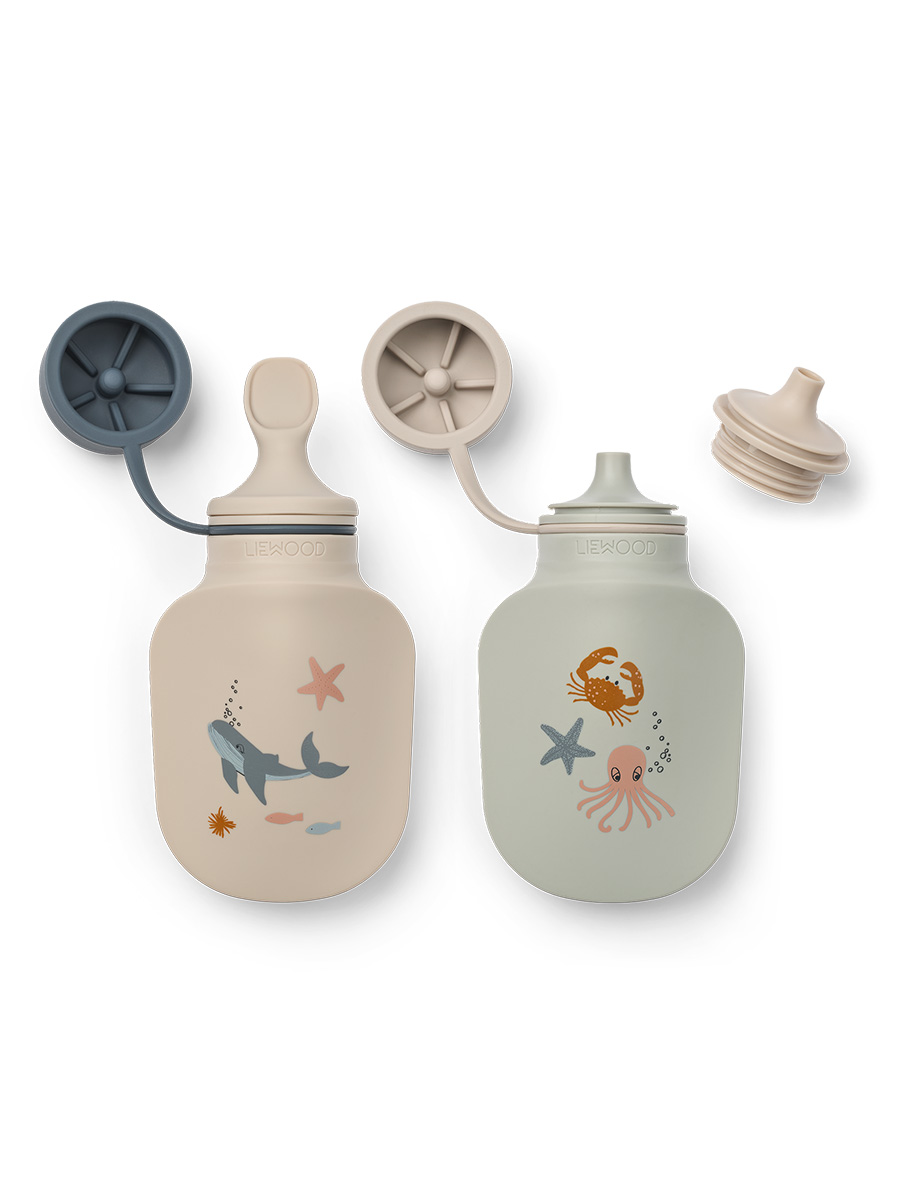 Smoothiepullo Lizzie 2-pack Sea Creature / Sandy on uudelleentäytettävä silikoninen pullo soseille, pirtelöille ja puuroille. Uudelleentäytettävä smoothiepullo sopii ihanteellisesti kotiruoille, jotka haluat ottaa mukaan. Ruoan voi syödä pullosta suoraan imemällä tai lusikanmallisen vaihtokorkin kautta, johon voit puristaa pienen määrän sosetta ja syöttää sen lusikan tavoin vauvalle. Et siis tarvitse erillistä lusikkaa!