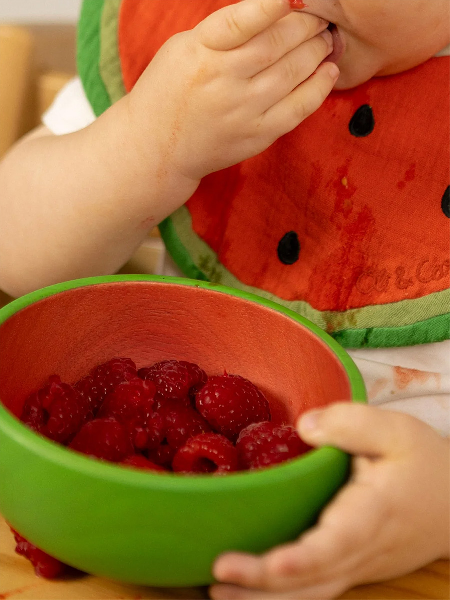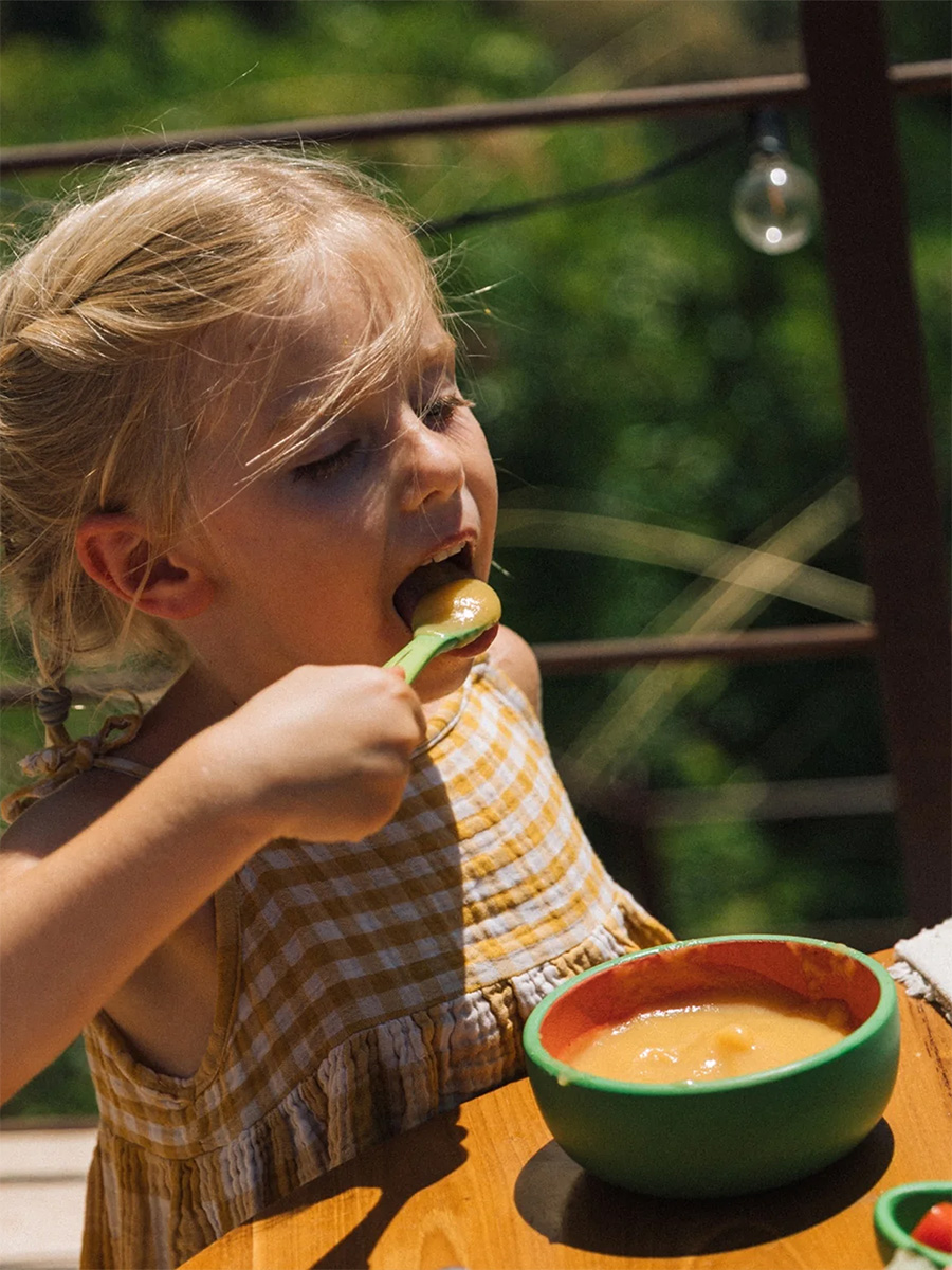 Astiat on käsinmaalattu luonnonpigmenteillä ja jokainen kappale on ainutlaatuisesti käsintehty, joten pienet väri- ja muotovaihtelut ovat normaaleja. Pienten käsien on kevyt ja helppo tarttua lusikkaan ja erittäin sileä pintakäsittely on hellävarainen vauvan ikenille ja hampaille.