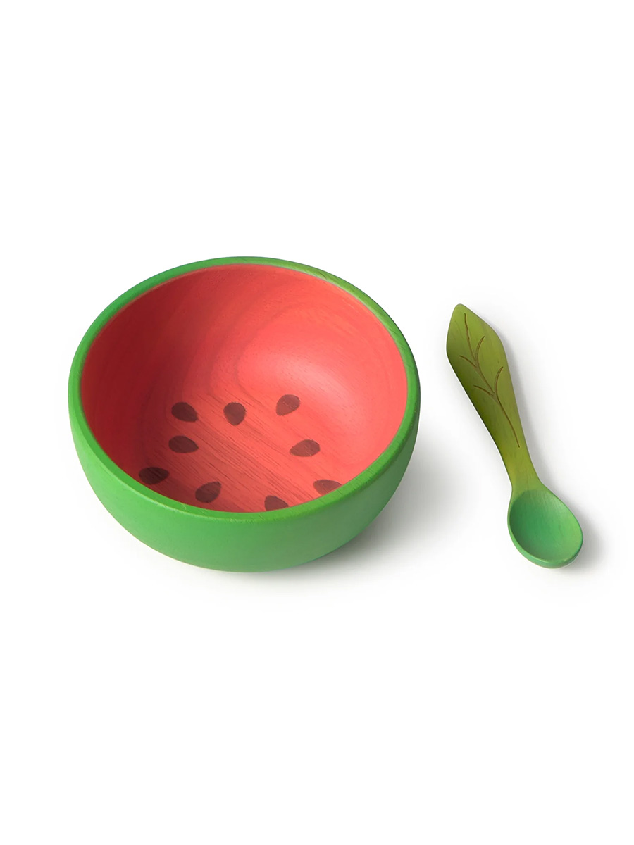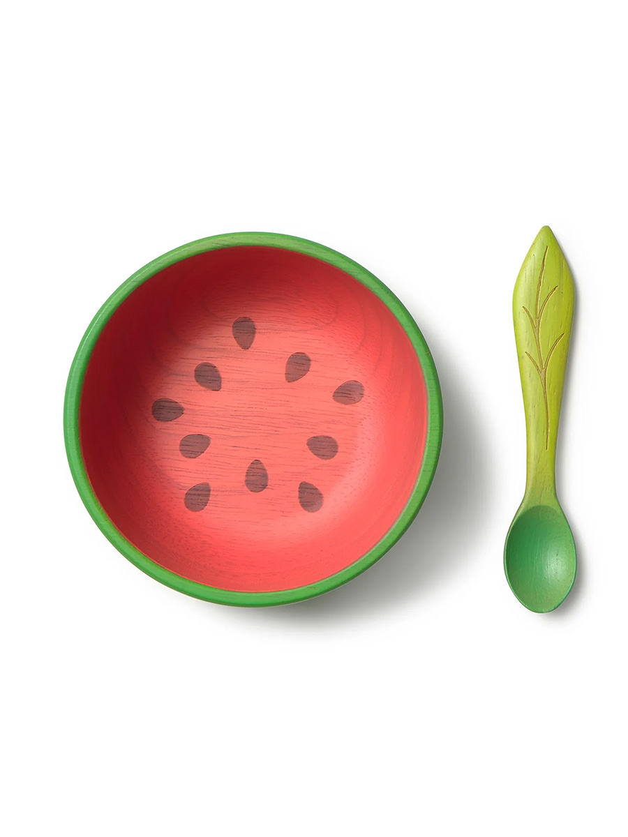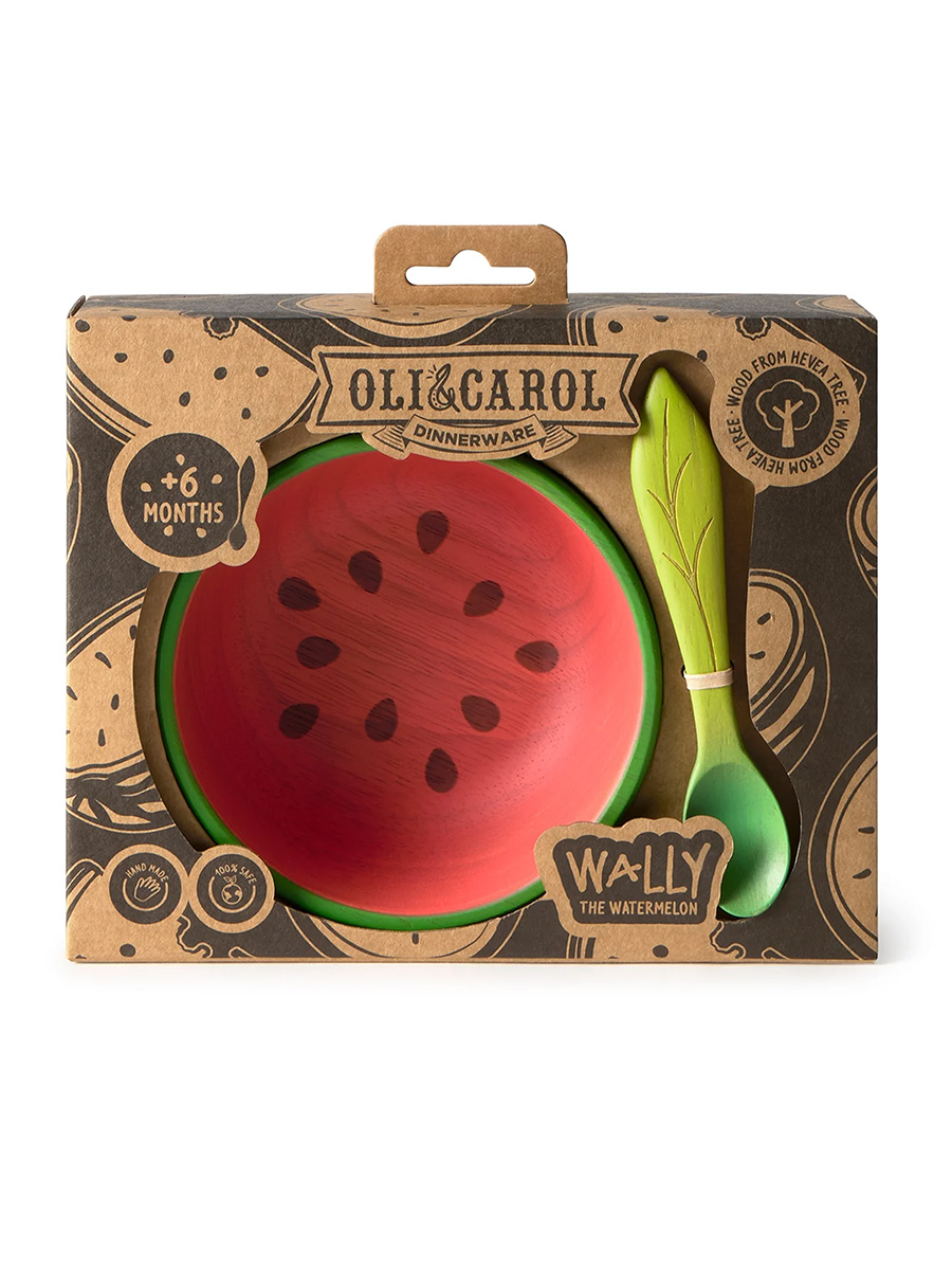 Oli&Carol kulho ja lusikka setti sisältää ihanan kulhon ja lusikan, jotka on käsintehty Hevea-puusta. Hauska ja värikäs muotoilu on saanut inspiraationsa kasvisten maailmasta. Puiset astiat ovat turvallinen, muoviton ja kestävä valinta lapsille ja antavat toisen elämän puille, jotka aikoinaan tarjosivat kumia Oli&Carol-leluille.
