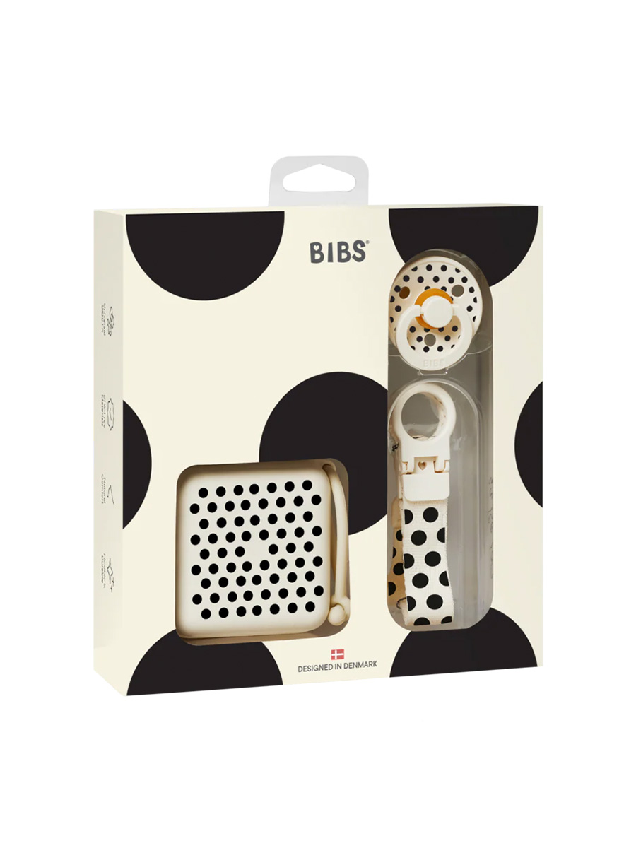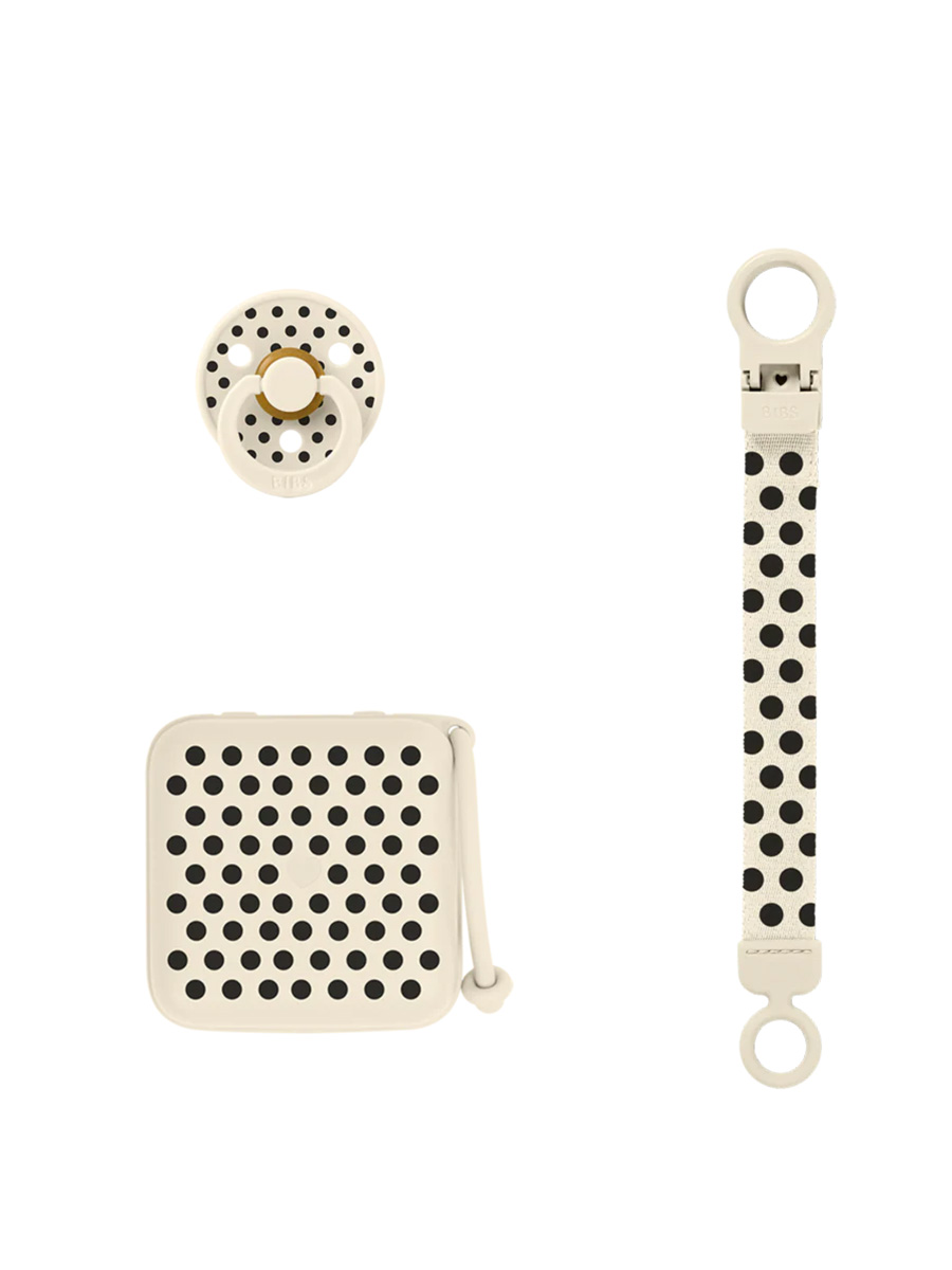 Lahjasetti Soothe & Go Polka Ivory Black on suunniteltu pitämään tutit käden ulottuvilla ja poissa lattialta. Tuttinauhan kätevä yhden käden kiinnitysmekanismi ja joustava silikonirengas kiinnittyvät turvallisesti kaikkiin BIBS-tutteihin, samalla kun tuttirasia pitää käyttämättömät tutit puhtaina. Sopii vastasyntyneestä alkaen!