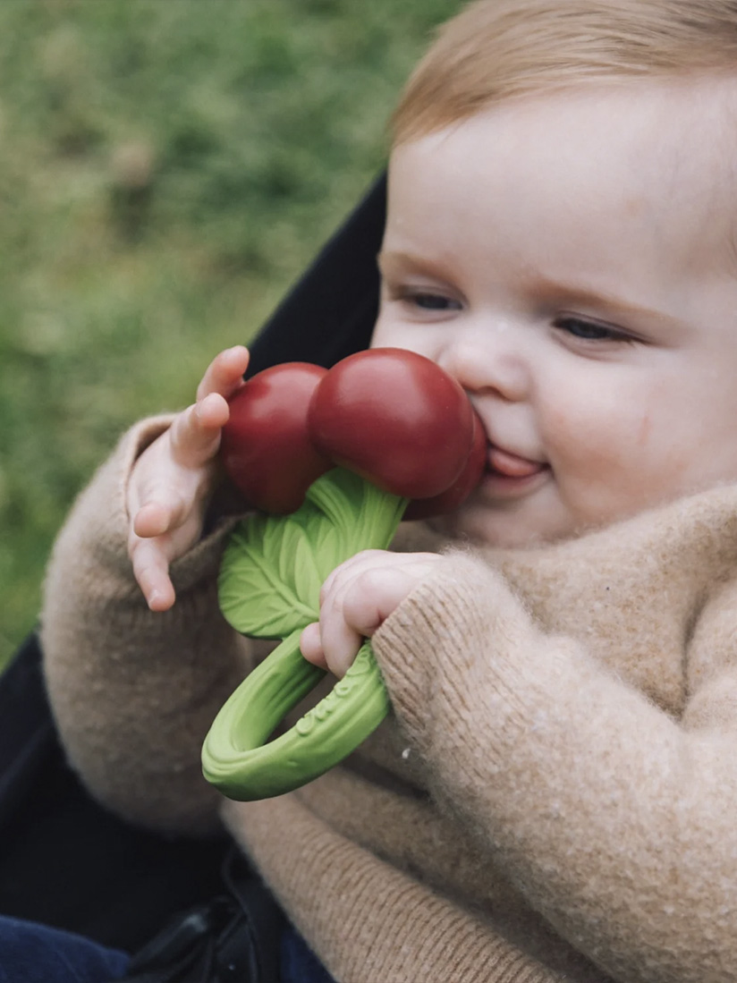 Lelu on valmistettu käsityönä, kestävällä ja ympäristöystävällisellä prosessilla, jossa käytetään 100% Hevea-puiden luonnonkumia. Koska lelut on valmistettu yhtenä kappaleena ilman reikiä, bakteerit eivät pääse muodostumaan sisälle. Lelut maalataan käsityönä yksi kerrallaan luonnollisilla pigmenteillä yksi kerrallaan, joten kahta samanlaista ei ole ja pienet epätäydellisyydet tekevät jokaisesta tuotteesta ainutlaatuisen.