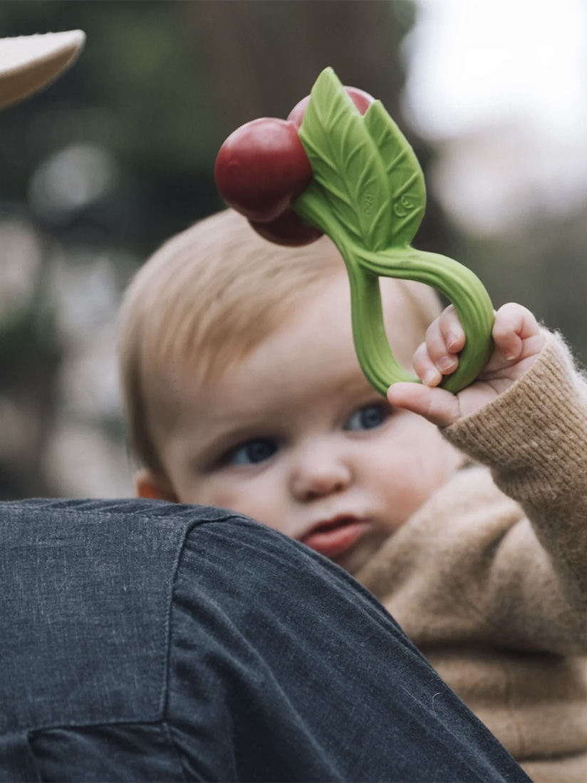 Helistimen sisällä on kirsikan kierrätettyjä siemeniä, jotka tekevät lelusta helistimen. Luonnollinen ääni on suunniteltu stiumuloimaan vauvan aisteja rauhoittavasti.