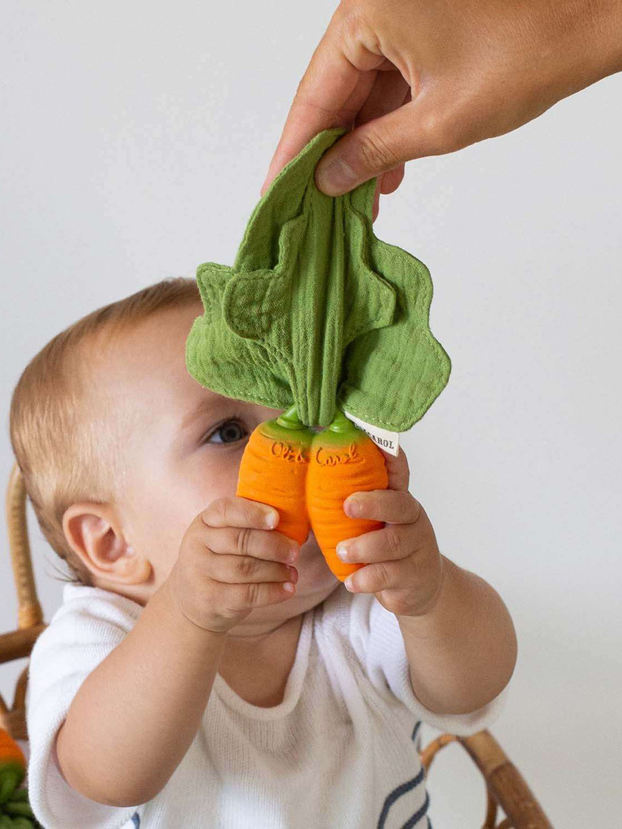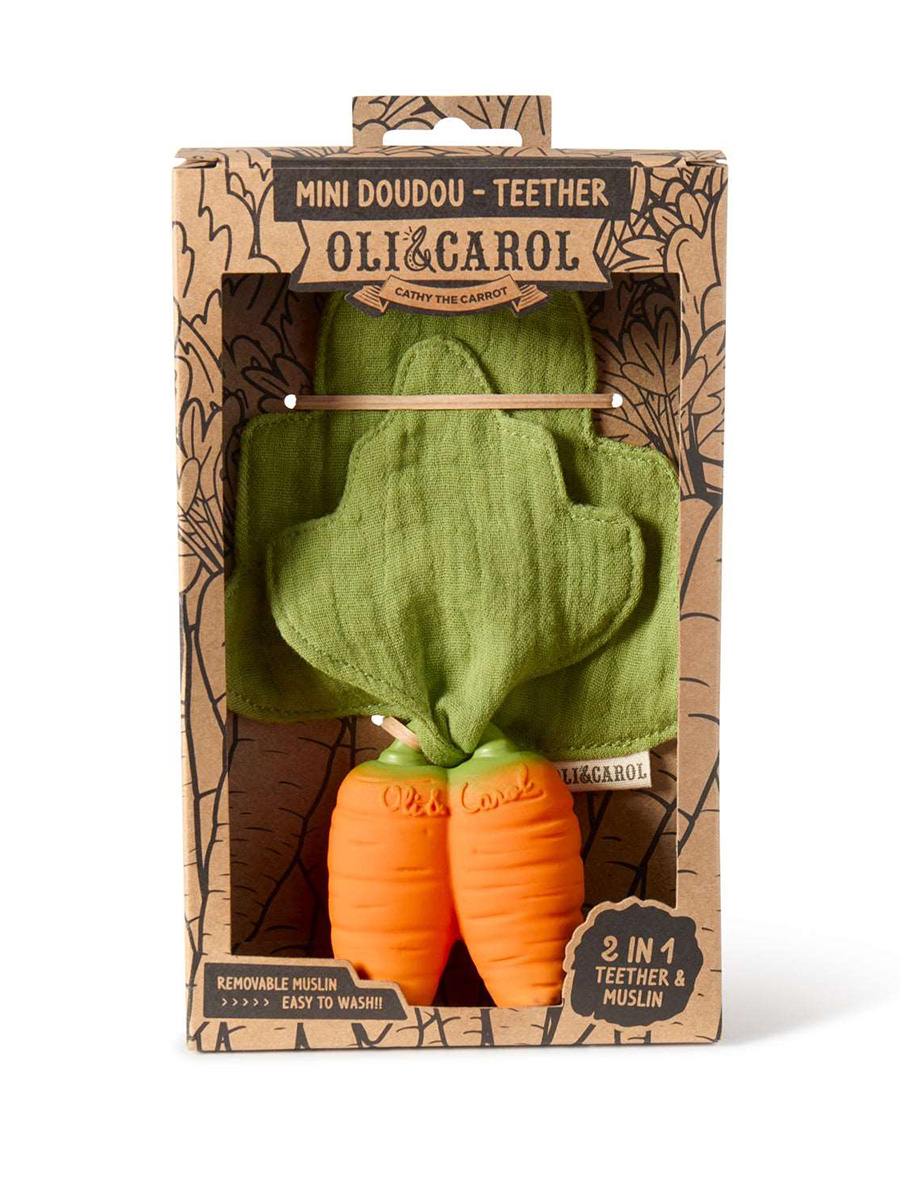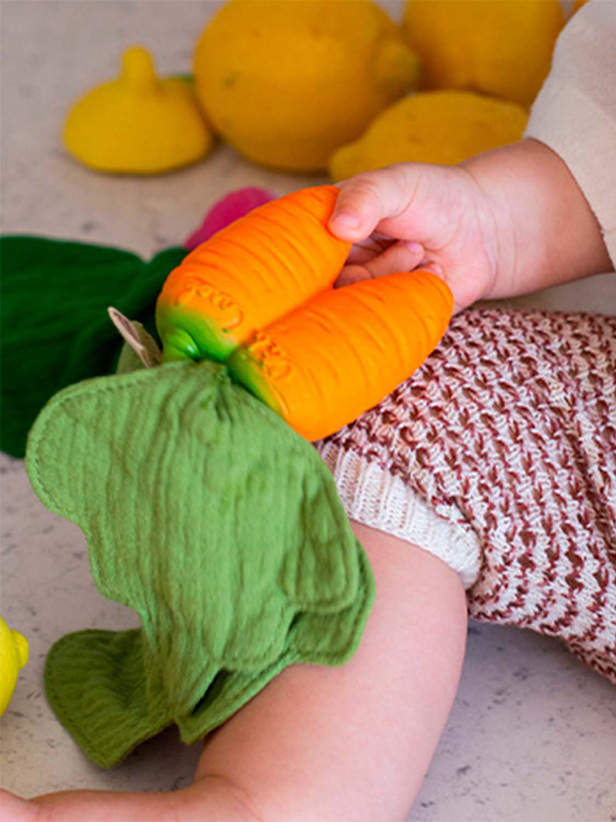 Purulelu Mini Doudou Carrot on kaksiosainen purulelu luonnonkumisesta porkkanasta sekä pehmeästä, kaksikerroksisesta musliinipuuvillaisesta liinasta. Osia voidaan käyttää ja pestä erikseen. Käytä puruleluna, kylpyleluna, aistileluna tai leikkikeittiössä!