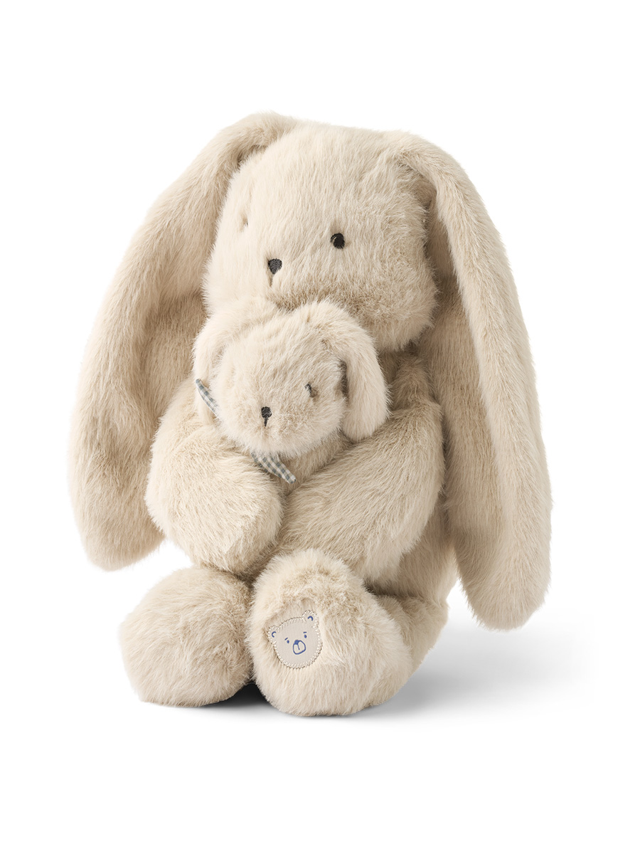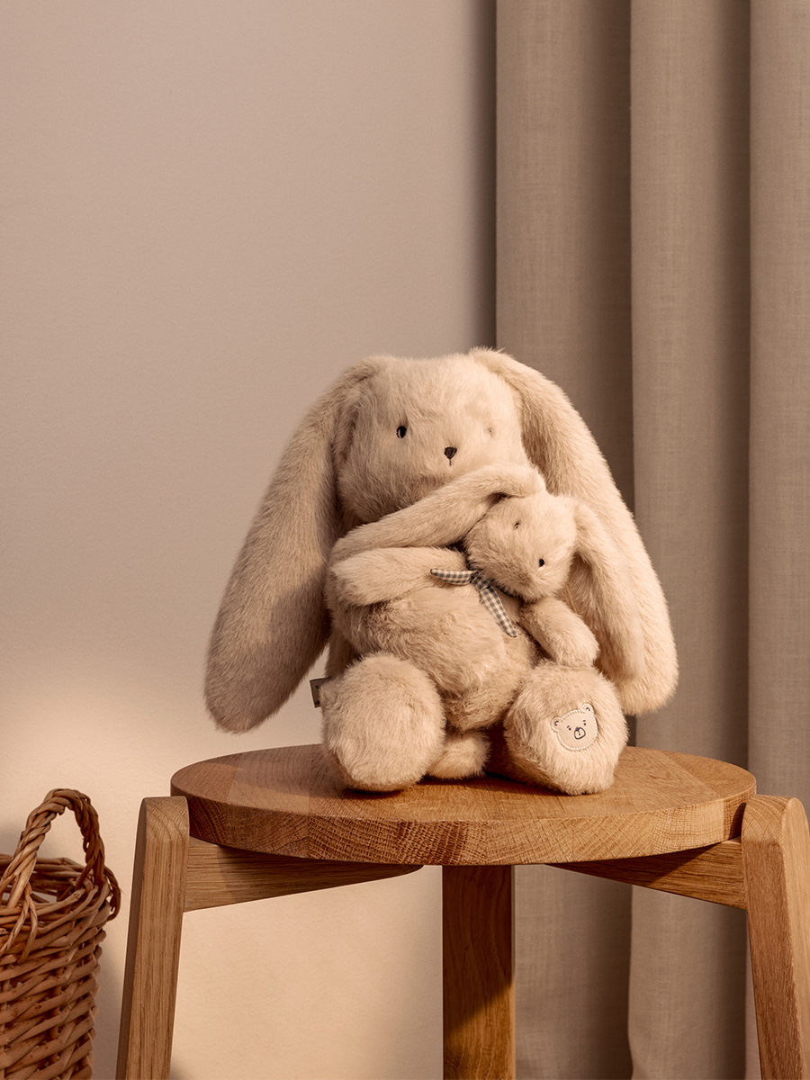 Pehmolelu Berto Rabbit on ylellisen pehmeä ja pörröinen pupukaksikko, iso pupu ja pieni pupu, jotka halailevat toisiaan. Pitkäkorvainen Berto on tehty kierrätetystä polyesteristä ja se osaa istua. Pehmeä pupunen vauvansa kanssa on suloinen ja turvallinen ystävä lapselle ja sopii ihanasti lahjaksi ja sisustuselementiksi lastenhuoneeseen, sekä ajatuksena korostaa vanhemman ja lapsen rakkautta.