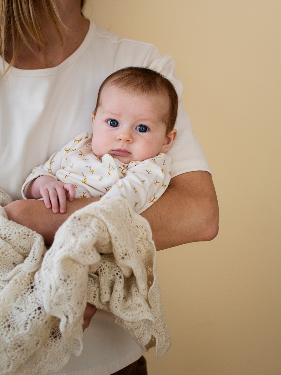 Puku on pehmeää ja mukavaa 100% luomupuuvillaa, jolla on GOTS-sertifikaatti. Kuosina on hennot kukkaset kermanvärisellä pohjalla.