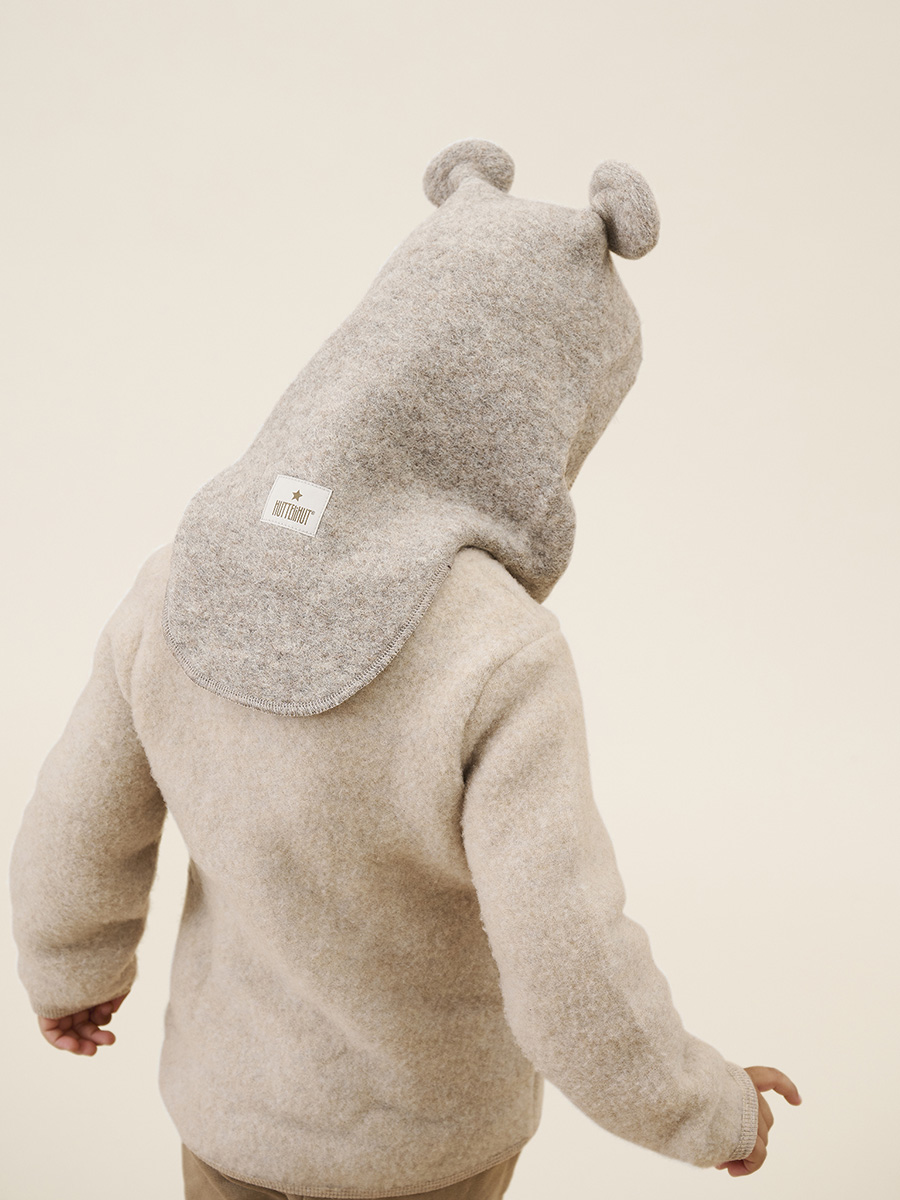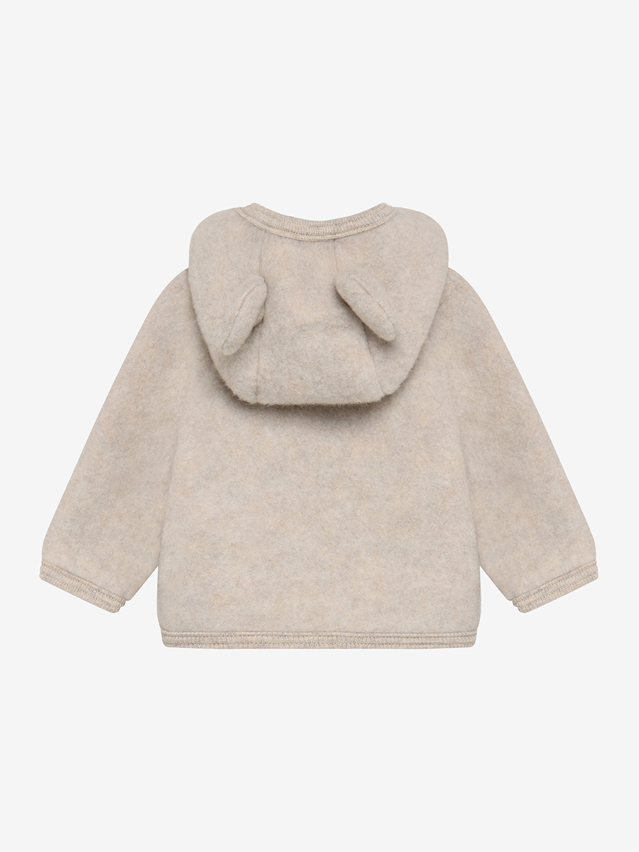 Takki wool fleece Camel Melange on lämmin ja ylellinen merinovillatakki pienille lapsille. Takissa on suloiset teddykorvat, pitkät hihat ja vetoketju edessä. Hihansuissa, helmassa ja hupun reunassa on pehmeä ribbiommel.
