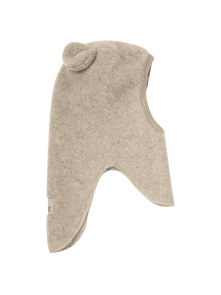 Kypärämyssy Balaclava ears wool fleece Camel melange on muhkean pehmeä ja lämmin kypärälakki untuvaisen pehmeäksi harjatusta, kaksinkertaisesta merinovillafleecestä. Pienet nallekorvat tuovat myssyyn leikkisän ilmeen. Kasvojen ympärillä oleva kuminauha ja pidennetty takaosa varmistavat, että kypärälakki istuu hyvin ja suojaa tuulelta ja kylmältä.