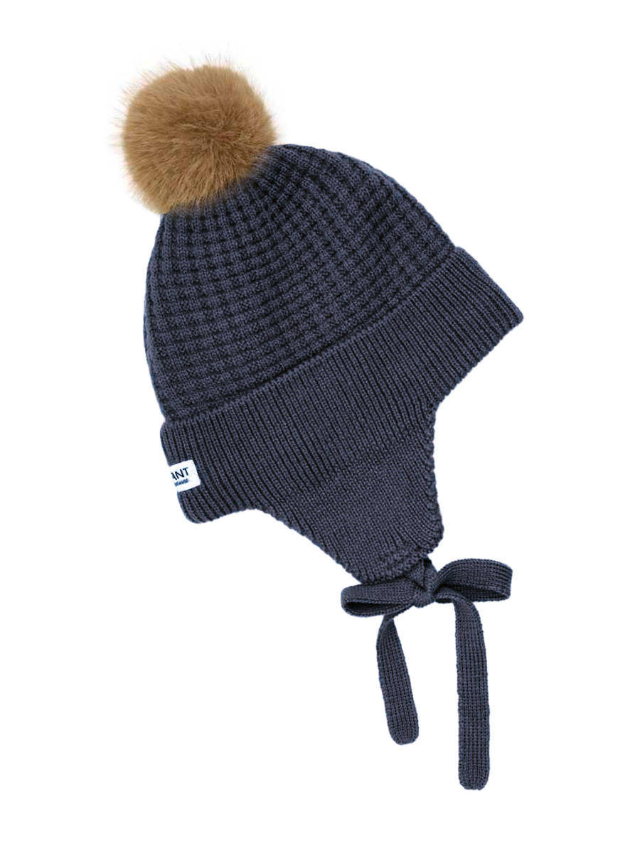 Myssy villasekoitetta Baby hat with fake fur Ebony on vauvan hattu joustavasta ja hengittävästä neuloksesta. Hatussa on lämmin fleecevuoraus sisällä sekä ruskea, pörröinen keinokarvatupsu. Korvia suojaa käännetty resori, jossa on korvia suojaavat läpät sekä leuan alle solmittavat nauhat.