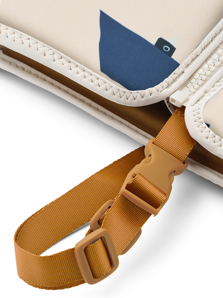 Liivi istuu tarkoituksella napakasti ja lisäksi jalkojen välissä kulkeva hihna varmistaa, että liivi pysyy paikoillaan eikä nouse korviin uidessa. Kokemuksemme mukaan tämä helpottaa oleellisesti lapsen uimista!