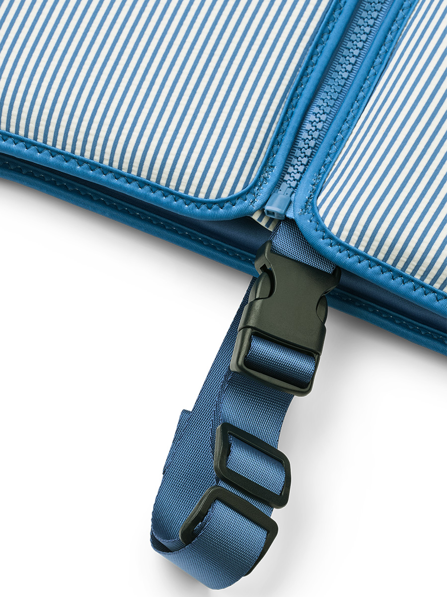 Liivi istuu tarkoituksella napakasti ja lisäksi jalkojen välissä kulkeva hihna varmistaa, että liivi pysyy paikoillaan eikä nouse korviin uidessa. Kokemuksemme mukaan tämä helpottaa oleellisesti lapsen uimista!